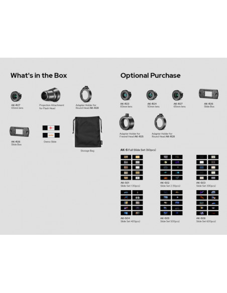 Designed with a universal 1/4" mount on the adapters, you can attach the projector directly to the light stand or with the flash. For camera flash, attaching the projector directly to the light stand will fix the light angle stably and avoid downward tilt caused by weight. A range of supporting accessories is the perfect choice to hold and conceal the AK-R21.