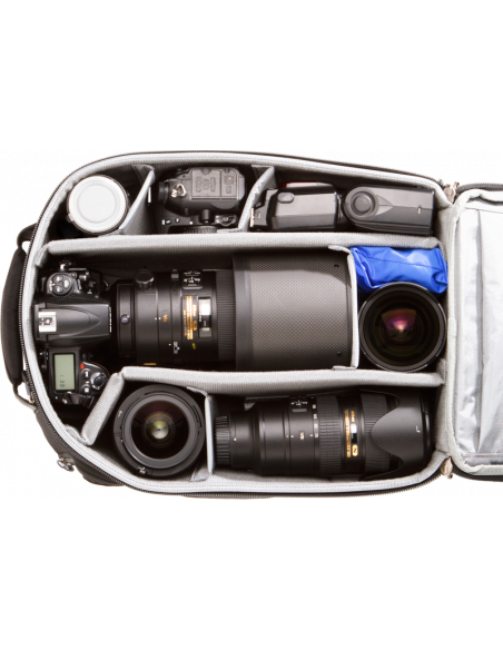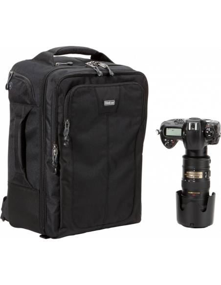 Rygsæk i håndbagagestørrelse. Passer til de fleste bagagerum over et flysæde og rummer et objektiv på op til 400mm f/2.8Vigtigste specifikationerOverholder de fleste internationale og amerikanske krav til håndbagage*Dit udstyr beskyttes af en kabellås og aflåselige lynlåse af typen YKK® RC FusePasser til en laptop på op til 15” og en tablet på 10”*Bed flyselskabet om deres gældende bestemmelser for håndbagageBemærk meddelelse fra Think Tank: På grund af en fabrikationsfejl er der en skrivefejl på nogle navneskilte på ydersiden af tasken som følger: “Airport Computer”. Vi undskylder fejlen.Yderligere specifikationerJusterbar sele, der følger kroppens form. Med lændestøtteHøjdejusterbart brystbælte og elastiske lommer på skulderremmenKraftige håndtag på tre sider gør det nemt at pakke og løfte kufferten opIndvendige netlommerBeslagsystem til trebenet eller etbenet stativ medfølgerRegnslag med forseglede syninger medfølgerDet aftagelige polstrede hoftebælte giver mulighed for brug af kamerabælter af typen Thin Skin eller Pro Speed BeltKompatibel med støtteremme til kamera (sælges særskilt)Hvad rummer denDSLR med grebObjektiv på 400 mm f/2.815” laptop10” tabletYderligere objektiver og udstyrSpecifikationerIndvendige mål:29,2 x 42,4 x 17,3 cmUdvendige mål:31,6 x 45,7 x 21,6 cmLaptop:27 x 40 x 3,5 cmVægt:1,5-1,9 kg, afhængigt af det anvendte tilbehørMaterialerUdvendig:Holdbar, vandafvisende belægning (DWR)Polyuretanbelægning600D polyLynlåse af typen YKK® RC Fuse (slidstærke)Metalhardware med forniklet antikbelægningNylonnetBundne nylontråde i tre lagIndvendig:210D sølvfarvet nylonVelexforing og ruminddelere med polyuretanbagside2 regnslag af nylontaft 210T med forseglede syninger og polyuretanbelægningRuminddelere af skum med lukkede celler og forstærket med PE-pladerLommer i gennemsigtigt netBundne nylontråde i tre lagI kassenRemme til trebenet stativForstærkede forede ruminddelereKabellåsRegnslag med forseglede syninger