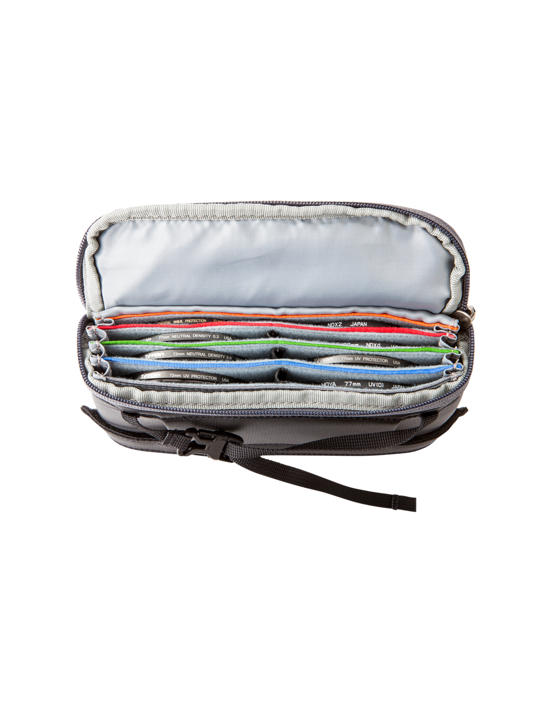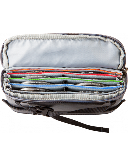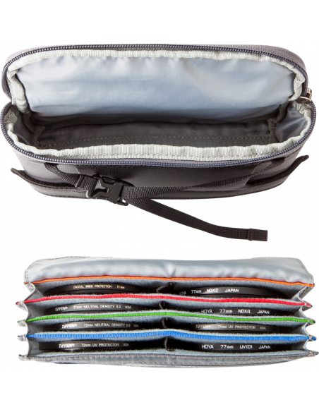 Hvad passer – Filter NestFilter Nest er to tasker i én og kan rumme op til otte runde filtre (op til 8,2 cm), herunder to variable ND-filtre i en orange ruminddeler, step up/ned-ringe, renseklude, objektivdæksler, rensepen m.m.Den polstrerede pose med lynlås i filtertasken beskytter sarte filtre mod støv og skrammer i marken. Eller du kan bruge det aftagelige indlæg, hvis du kun medbringer lidt bagage.VIGTIGSTE FUNKTIONER:Den polstrede pose med lynlås giver maksimal beskyttelse i markenDet aftagelige indlæg er ideelt, hvis du kun pakker lidt bagageFarvekodning hjælper med organiseringen. Plads til otte runde filtre, herunder to variable ND-filtre. Fjerner behovet for plastposer i taskenYderligere funktionerTasken kan sættes på et bælte og er kompatibel med de fleste MindShift Gear-rygsække, når du skal have hurtig adgang til filtre, når du forbereder en optagelse. Håndtaget med SR-spænde gør det endvidere muligt for fotografer at hænge tasken på et trebenet stativ, så der hurtigt kan udskiftes filter, når hurtighed er afgørende.Kan monteres på et bælte og give hurtig adgang til filtre, når du forbereder en optagelse (kompatibel med r180° Panorama, Horizon eller r180° Pro)Håndtag med SR-spænde gør det muligt at hænge tasken på et trebenet stativ for hurtig adgangPlads til renseklud i lomme på forsiden med lynlåsSpecifikationerUdvendig taske:20.5 x 11 x 7,5 cm (Filter Nest)Aftageligt filterindlæg:18.5 x 9,5 x 4,5 cm (Filter Nest)Runde filterlommer:8,6 x 9,0 cm (Filter Nest)Vægt:0,2 kg (Filter Nest)MaterialerUdvendig:Holdbar, vandafvisende belægning (DWR), polyuretanbelægning, 100D nylon med rip-stop, 210D nylon af høj styrke, nylontråde i tre lagIndvendig:Nylexforede filterlommer, antilonskum med lukket celle, nylonbindingstape, nylontråde i tre lag