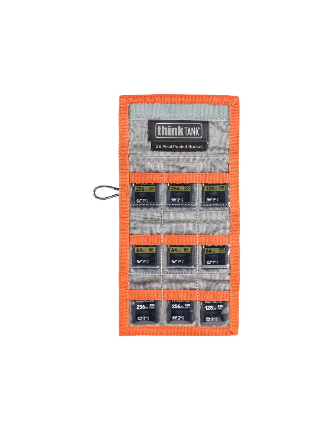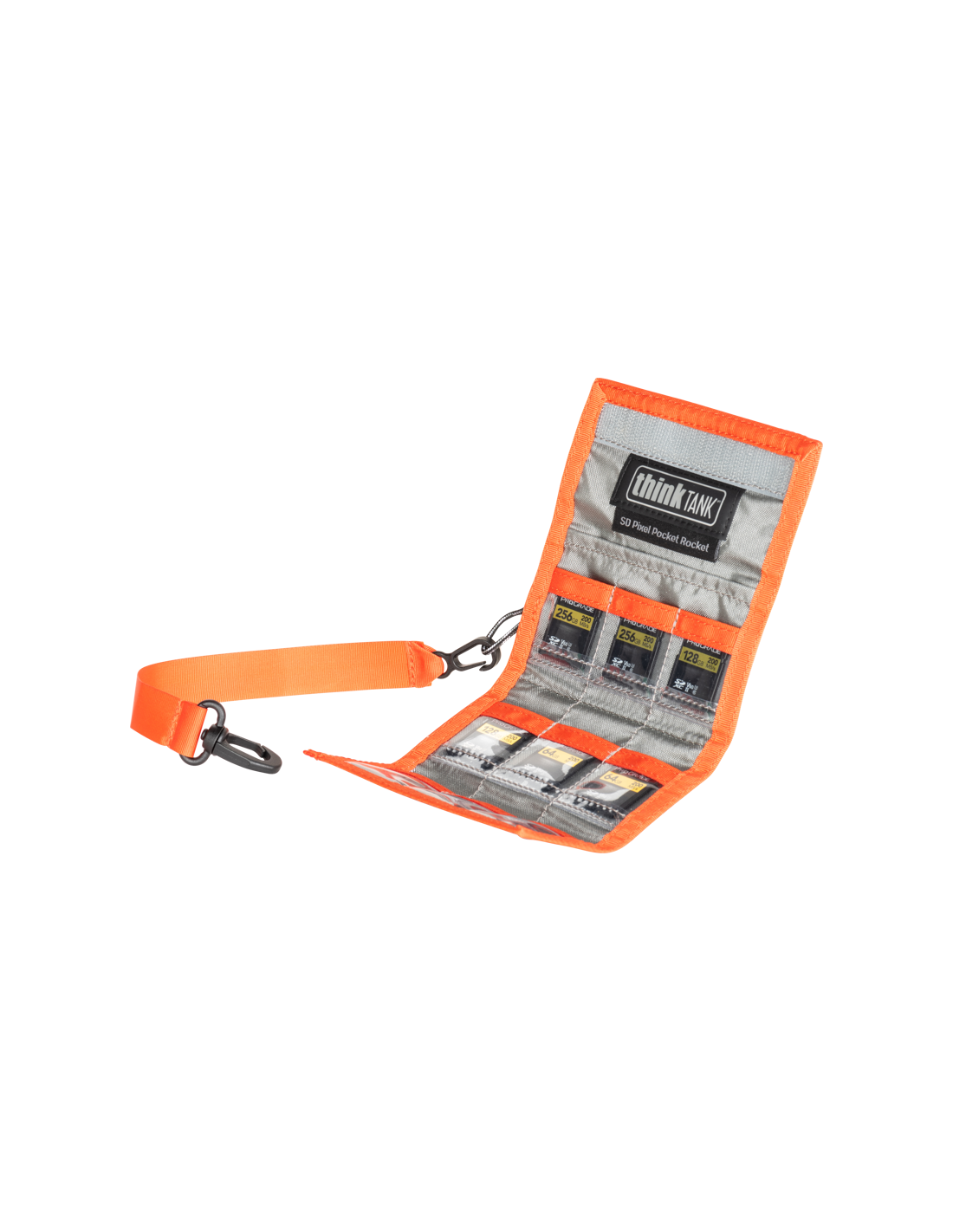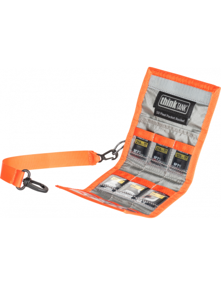 Det orange Pixel Pocket Rocket etui fra Think Tank rummer 10 CF-, 10 XQD- eller 10 CFexpress-hukommelseskort i sine gennemsigtige kortholdere. Blandt holderne til hukommelseskort finder du bl.a. en lomme med lynlås til hukommelseskort, der kræver større sikkerhed.Pixel Pocket Rocket kan bruges til at beskytte og opbevare hukommelseskort i en større taske eller kuffert, og bæltestroppen og den aftagelige snor giver dig mulighed for at opbevare dine hukommelseskort inden for umiddelbar rækkevidde. Den udvendige side er vævet af vandafvisende nylon, der giver slidstyrke og modstandsdygtighed over for vand, og har et id-etui, der kan bruges til en mærkat om indhold eller oplysninger om ejeren.De vigtigste specifikationerRummer 10 CF-, 10 XQD- eller 10 CFexpress-hukommelseskortGennemsigtige holdere til hukommelseskort8 åbne holdere, 1 lomme med lynlåsBæltestropAftagelig snorBagudvendt id-etuiFremstillet af vandafvisende nylon