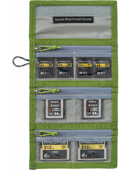 Secure Pixel Pocket Rocket har lynlåslommer, der giver maksimal sikkerhed til flere kortstørrelser.At holde styr på hukommelseskort er af største vigtighed for fotografer. Praktisk foldbar pung til 6 CFast- eller CFexpress-kort, type B, eller 12 SD- eller CFexpress-kort, type A, eller mange microSD-hukommelseskort. Passer nemt i lommen eller kan fastgøres til bæltet eller tasken.**NØGLEFUNKTIONERFoldes sikkert, fastgøres og indeholder indholdBeskyttet med slidstærkt og vejrbehandlet dobbelt ripstop-materialeI lommestørrelse med aftagelig sikkerhedssnor og bæltebeslag**EKSTRA FUNKTIONERHver stil er unikt farvekodet for nem identifikationKlare individuelle kortlommer til at se indholdet Vend kortene rundt, når de er brugt/fuldeUdvendigt vindue til ID-etiket**HVAD PASSER?6 CFast-hukommelseskort6 CFexpress, type B-hukommelseskort12 SD- eller CFexpress-hukommelseskort af type AFlere microSD-hukommelseskort**SPECIFIKATIONERFoldet sammen: 13,5 x 7 x 2,5 cm**MATERIALER*UdvendigtNP 320D Double Diamond RipstopHoldbar vandafvisende (DWR) belægning210D nylonKlar PFTNylon-bindetapePolyurethan-belægning3-lags limet nylontråd