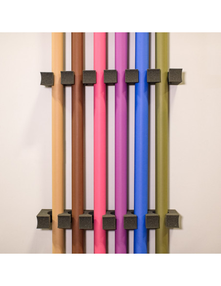 Hard-working photo backdrops need a place to call home when not in use. Seamless Paper Storage Clip provides an easy-to-use solution that protects rolls from wear and tear and keeps them organized too. Flexible polyurethane is sturdy and allows for easy backdrop insertion and removal. A set of two seamless paper holders stores 6 – 12 rolls (depending on backdrop size). One clip is sufficient for holding rolls up to 53″ in height. Two clips should be secured near top and bottom for holding rolls over 53″ in height. Multiple sets can be mounted side by side for quick color inventory.