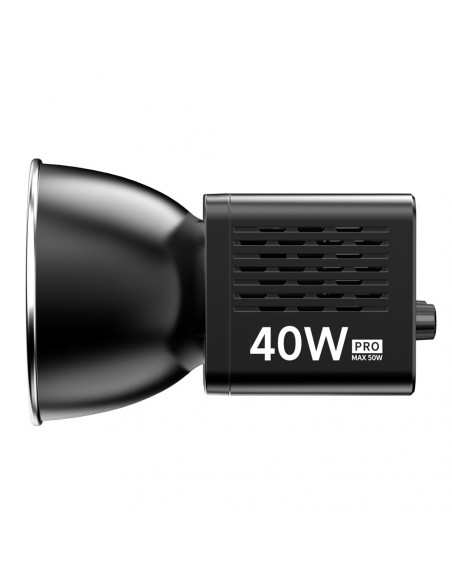 40WPro video light The Ulanzi 40WPRO COB Fill Light Black is a compact but powerful 40W Bi Colour LED fill light. This pocket sized lamp has an adjustable colour temperature from 2500 to 6200K, a separate dimming function from 0 to 100% and an operating time of up to 50 minutes at the maximum output of 50W (Overclock mode). Weighing only 1 pound, this cube lamp can be easily held in the hand or mounted on a stand via the 1/4" 20 threaded hole. Highlights Bi Colour COB lamp beads with high brightness ensure constant output Handy and easy to hold Built in 3400mAh battery Colour temperature ranging from 2500 6500k, CRI reaches 95+ Comes with 8 preset light scene effects Built in battery The built in 3400mAh high capacity battery supplies power to the lamp, which can be used without being plugged in. The lamp's battery charges in three hours and lasts up to three hours depending on the brightness level. With DC and Type C charging ports, 65W PD supports fast charging. A mini diffuser is also included to soften the light, which can be attached via a mini Bowens mount. Tips: When charging with the DC port or Type C port during use, the maximum power of the light is 40W. Make sure your charger and charging cable support charging with PD up to 65W. The charging cable is sold separately. The main difference between the Ulanzi L023 40W Pro and LT028 40W Light is that the 40W Pro Light has a 50W overclocking mode and supports Type C charging. All other features are the same. , Model: L023 40W Pro Dimensions (without reflector): 10.5 x 8.5 x 8.5 cm Weight (without reflector): 490 g Lamp beads: Bi colour COB lamp bead Colour rendering index (CRI): ⥠95 Colour temperature (CCT): 2500K 6500K Lumen efficiency (with reflector): 13150 lux (at 6500K, 0.5 metres) Beam angle: 120° Charging port: DC 19V/3.4A, Type C PD 65W Power (normal mode): 40W Max output power (overclocking mode): 50W Max burn time brightness (50W): 50 minutes Max. power on time brightness (40W): ⥠70 minutes Minimum brightness duty cycle: ⥠180 minutes Battery: 14.8V/3400mAh (50.3Wh) Charging time: about 3 hours , 1 x Ulanzi 40WPRO COB Fill Light Black 1 x Reflector 1 x Diffusion Dome 1 x Velvet Bag 1 x User guide