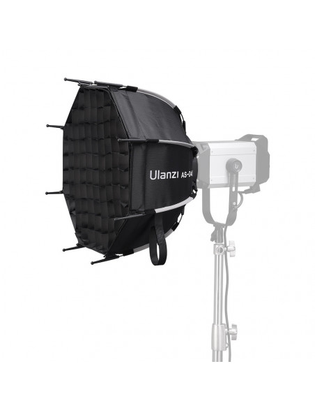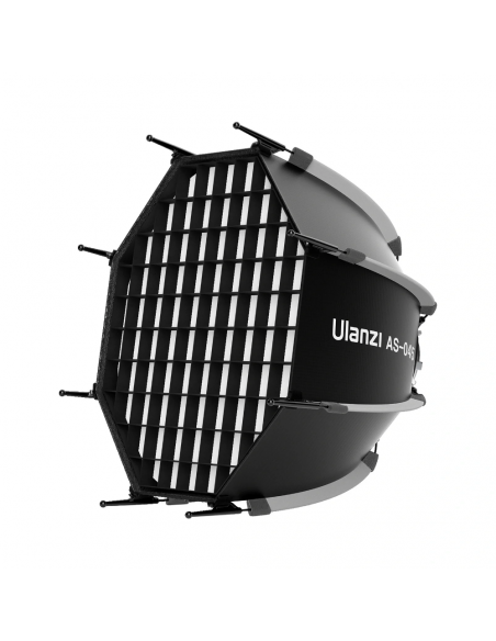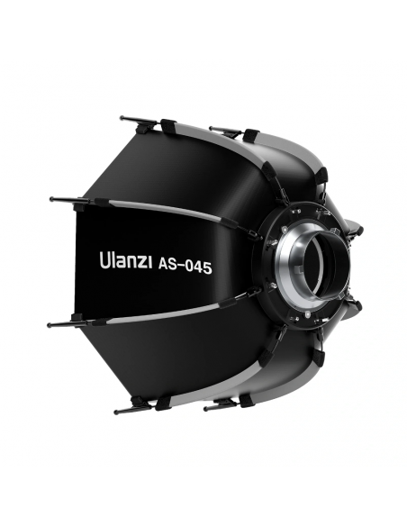 Create a round light beam with soft edges The Ulanzi AS 045 Quick Release Octagonal Softbox With Grid 45 cm Bowens is designed to set up and fold down quickly. The softbox delivers a round light beam with soft edges that is great for portrait and fashion photography. Highlights Easy setup and quick to set up High quality and durability Adjustable light direction Easy installation and quick set up The innovative quick release structure allows for effortless installation and removal in just 15 seconds. Ulanzi's parabolic softbox weighs only 790 grams and comes with a storage bag, making it ideal for photographers who are often on the go. Adjustable light direction Supports one to three layers of diffusers, inner baffle, front diffuser and Grid to provide a variety of lighting effects. The removable inner diffuser and outer diffuser soften light and reduce exposure by 2.1 stops. A fabric grid is included to reduce the beam angle and control unwanted light. High quality and durability The stainless steel bracket provides exceptional strength and durability to the softbox, ensuring long term use without distortion. It offers enhanced contrast and tactile feel, while the reversible deflector element eliminates a hot spot in the center. Compatible with lamps with Bowens mounts The Ulanzi Softbox is compatible with GODOX M200D/M300D, Aputure LS 60d/x / LS C120d II/ Amaran 100 200dx/Amaran COB 60d/60x, and ordinary studio lamps; Suitable for photography speedlites, strobes and etc., Model:AS 045 Product weight: 709 g Softbox opening: Φ 45 cm External diffusion size: Φ 42 cm Internal diffusion size: Φ 33,5 cm Honeycomb size: Φ 43 cm Material: Oxford cloth, aluminum alloy , 1 x Ulanzi AS 045 Quick Release Octagonal Softbox With Grid 45cm Bowens 1 x Carry Bag 1 x User Manual 1 x Internal Diffusion 1 x External Diffusion 1 x Honeycomb Grid