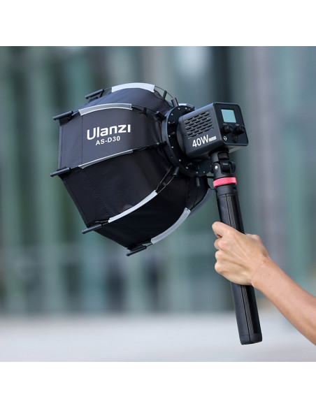 Create soft and even light The Ulanzi AS D30 Octagonal Softbox With Mini Bowens Mount And Grid 30 cm is ideal for portrait or product photography. The softbox is quick to open and collapse. It is lightweight, easy to fold and convenient to store or carry. The Mini Bowens mount is perfectly compatible with Ulanzi LT028 40 W and LT005 60 W video light. Highlights Ideal for portrait or product photography. Easy to carry Effortless to set up and take down Perfect match for COB lamps With the Mini Bowens mount, it is ideal for a wide range of lights from Ulanzi. Easy to carry It weighs around 500g, making it perfect for travelling. Effortless to set up and take down It has a Click lock design and is quick to assemble. Born for versatility The double diffuser and grid ensure beautifully soft and even lighting., Mounting: Mini Bowens mount Dimensions: 28. x 14.3 x 14.3 cm Diameter: 30 cm Depth: 23 cm Weight: 300 g , 1 x Ulanzi AS D30 Octagonal Softbox With Mini Bowens Mount And Grid 30 cm 1 x Inner diffusor 1 x Front diffusor 1 x Grid 1 x Carring bag