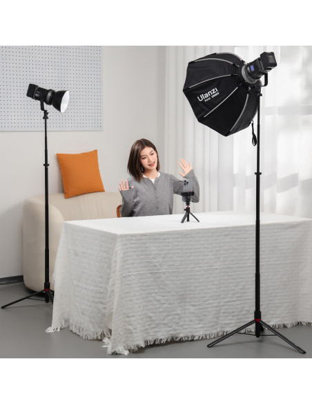 The ultimate tripod The Ulanzi AT 05 2M Heavy Duty Foldable Light Stand is perfect for professionals and enthusiastic content creators alike. With an extendable height of up to 2 metres, a sturdy aluminium design and a load capacity of up to 5 kg, you are always guaranteed stability and flexibility. Thanks to the quick unfolding function and precise adjustment options, you'll have the perfect setup in any situation. Highlights Made of strong aluminium alloy, supports up to 5KG. Compact enough to fit in one hand. Up to 2 metres high, 6 piece eccentric tube design for smooth adjustments. Compatible with the AT 02 portable tripod dolly and Uka inverted ball head. Universal compatibility with the 1/4â attachment. Powerful, compact and versatile The compact design makes it easy to fit in one hand, while providing a robust and stable base for all your equipment. Extendable up to 2 metres With an extendable height of up to 2 metres and an innovative 6 piece tube system, you adjust the height effortlessly. The double locking system ensures you create a stable set up quickly and easily. The unique eccentric tube design makes locking and unlocking intuitive: turn clockwise to lock and anti clockwise to unlock. Fast unfolding Thanks to the handy push button, the tripod can be unfolded instantly, but pay close attention to your hands when folding and unfolding! The sturdy aluminium design and wide base allow you to safely support equipment up to 5 kg. Universal 1/4â attachment For precision work, the index marks help you set exactly the right angle. Moreover, the universal 1/4â mount offers the flexibility to easily mount video lights and other accessories., Model: AT 05 Material: Aluminium alloy + ABS Sections: 6 sections Load Capacity: 5kg Non extended Size: Ф45*480+5mm Expanded Size: Ф704 x 2023mm x 5mm Weight: 1100g , 1 x Ulanzi AT 05 2M Heavy Duty Foldable Light Stand 1 x User guide