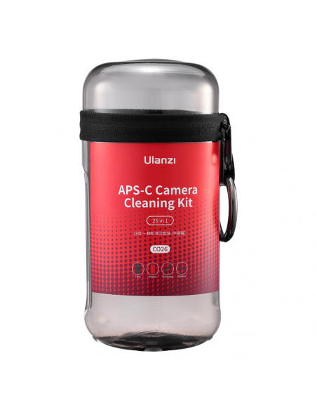 The complete cleaning kit The Ulanzi CO26 Camera Cleaning Kit for APS C cameras contains 26 essential parts for cleaning cameras. All neatly packed in one box, convenient for travelling, keeping your camera clean and free from dust, fingerprints, smudges, water spots and more. Highlights Always keep your camera clean Convenient on the go Contains 26 essential parts Take anywhere, always clean Carry all 26 cleaning tools in one bag, convenient for on the go. Three major issues, one time cleaning Easily dissolves lens dust, floating particles, fingerprint smudges and residual water spots. Widely applicable Can clean various precision products such as cameras, mobile phones, binoculars and glasses. Sensor Cleaning Wipe Easily removes imperceptible dust and particles, and removes dirt Note; Applicable on 16 mm, APS C cameras) Wet cleaning cloth Made of high density nano level fibre material, supplied with its own cleaning solution, no crumbs or edges, vacuum packed, ready to use after disassembly. Cleaning solution Mild and alcohol free, does not damage the lens coating and easily dissolves stubborn stains (*Mandatory use with lens cleaning cloth) Air blower Nozzle is small for concentrated air output, air volume is large for easy dust removal, all without damaging lenses. Lens cleaning pen Pro Thoughtful and practical design, dust removal and disinfection, safe and easy cleaning. Cotton swab The pointed design solves the problem of hard to clean crevices and is used to clean contacts, connectors, crevices, corners, etc. Optical cleaning cloth The paper is soft and strong, and does not fall off when wiped (Note: It is not recommended for wiping CMOS)., Model: CO26 Dimension: 155 x 74mm Weight: 209g , 1 x storage container 10 x APS C sensor cleaning wipes 10 x Wet cleaning cloth 1 x Cleaning solution 30 ml 1 x Air blower 1 x Lens cleaning pen pro 6 x Cotton swabs 1 x Optical cleaning wipes (1 pack/ 50 pcs)