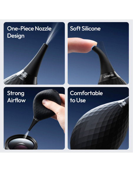 Powerful, safe and dust free The Ulanzi CO73 Integrated Air Blower is an essential tool for photographers and videographers who want to keep their equipment in optimal condition. Whether you're on location or working in the studio, this air blower offers a safe and efficient way to keep your equipment dust free. Highlights Safe and effective cleaning Comfortable grip Environmentally friendly material Safe and effective cleaning The nozzle is built into the housing and cannot come loose, so you can clean without worrying about damaging your equipment. Comfortable grip Made from high quality, elastic silicone material that feels pleasant to the touch and springs back quickly for efficient airflow. Environmentally friendly material Made from non toxic, odourless silicone material that complies with RoHS standards., Model: CO73 Material: Highly elastic silicone and ABS Dimensions: 123.6 x 58 x 58 mm Weight: 53 g