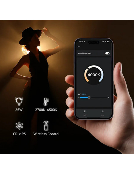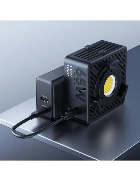 Small in hand, big in demand The Ulanzi EC65 65W Portable Bi Colour LED Video Light (EU PLUG) delivers professional two colour lighting (2500K 6500K) in a compact design. With seamless brightness and temperature control, this ultra portable lamp provides customisable lighting for videos, vlogs and photography, allowing creators to achieve perfect lighting anywhere. Weighing just 250g, this cube lamp is your perfect travel buddy. Highlights A professional two colour light from 2500K 6500K in a compact design. With detachable power supply module Use the Ulanzi Connect App to improve your lighting efficiency Breakthrough detachable power supply module design Handier for everyday use, more convenient for storage, a good partner for travelling and shooting. 65 W of power, performance in every pixel Don't let the compact design fool you, the lamp is a real powerhouse with 70W of bright, consistent power for flawless results every time! At 0.5m distance with 100% brightness: 2700Kï¼6000Lux; 6500Kï¼8000Lux From warm to cool, everything under control Easily choose the perfect ambience with the stepless rotary knob, adjust the CCT from 2700K to 6500K and dim to the desired level. Get precise control and check your settings in real time on the intuitive display. Perfect lighting, every time! App control Whether you adjust the HSI or CCT, or connect and control multiple lamps (up to 3) at once, you can use the Ulanzi Connect App to improve your lighting efficiency. V 0 flame retardant ABS+PC casing Complies with the UL94 flame retardant standard. It has excellent resistance to high temperatures and flames, extinguishes quickly by itself, prevents spreading and dripping and ensures durability and safety. Create with 13 effects Unleash your creativity with 13 built in lighting effects such as flash, strobe and pulse. Whether you go for cinematic drama or artistic flair, these effects help you create the perfect mood for any scene! Three power options Never worry about running out of power. Choose from three convenient options: the built in 46Wh battery, the DC adapter or the PD charger(optional) for quick and efficient charging. Stay charged no matter the situation! Optical capacitor Lens with high light transmission that increases illuminance by about 6.5 times for more efficient spot lighting. Reflector Silver reflective layer that increases illuminance 6.3 times and improves the depth and dimension of light. Diffuser Soft light with soft shadows for a natural, lifelike effect., Features 65W Cube Light Model: EC65 Material: ABS+PC Dimensions: 103 x 93 x 61 mm Weight (the light alone): Approx. 250g Max. Power (lamp bead): Approx. 65W Max. Power (the light): Approx.70W CCT: 2500K 6500K DIM: 0% 100% CRI: â 95 Beam angle: 120° Power input: DC (20V/4A) Type CPD (20V/5A) Mounting: Mini Bowens bracket Battery Features Afmetingen: 93*93*35mm/3.66*3.66*1.38inch Weight: Approx. 280g Input: 20V/2.25A(Max) Output: 20V/2.25A(Max) Capacity: 46Wh Power input: Type C PD Runtime: Approx. 40 minutes (6500Kat 100% brightness, 25°C) Power adapter features Power rating: 80W Input: AC100~240V 50/60Hz.2.5A(Max) Output: 20V/4A(Max) Features Optical capacitor Dimensions: 85.2 x 41.5 mm Optical power: â6.5x Mounting: Mini Bowens mount Reflector features Dimensions: 79 x 82 x 70 mm Optical power: â6.3x Mounting: Mini Bowens mount Diffuser Features Dimensions: 89.3 x 118.4 mm Mounting: Mini Bowens Mount , 1 x 65W Cube Light 1 x Battery 1 x Reflector 1 x Diffuser 1 x Power adapter (with charging cable) 1 x User guide 1 x Optical capacitor