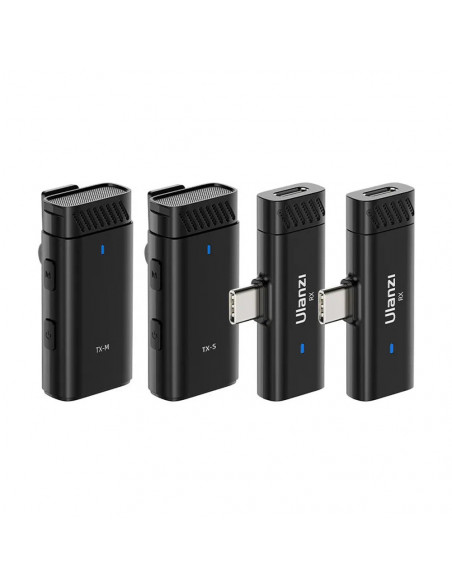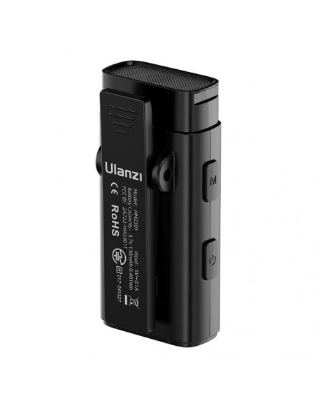 Dual channel wireless microphone The Ulanzi HM2301 Dual Transmitter Multi Device Wireless Microphone is a versatile wireless microphone system designed for recording audio with multiple devices. Highlights Multi Receivers Easy to operate 30m stable transmission Plug & Play Connect up to 10+ devices simultaneously Effortlessly connect to a large number of devices with dual transmitters. Perfect for live streaming, interviews and video recording on multiple platforms. 48 kHz high quality sound Capture all the details with 48 kHz 16 bit audio sampling. The microphone capsule captures voice from 360° omni direction, delivering crystal clear and immersive sound. Effortless switching between modes Adapt to any recording situation with 4 adjustable volume levels and three modes: noise reduction, mute and reverb. Lightweight and compact Weighing just 12 grams, the clip on microphone will not weigh down your collar and maintains a streamlined appearance during recordings. With the storage case, you can easily carry it with you. Stable wireless transmission over 30m Enjoy reliable wireless performance with a 2.4GHz frequency band, with stable transmission over 30m. Plug & Play, charging while in use Plug and play setup with 2.4GHz frequency band, keep your creativity going with the Type C charging port whenever you want., Dimensions: 47 x 10.8 x 15.8 mm Weight: 12 g Sampling frequency: 48 kHz 16 bit Frequency range: 20Hz~20kHz Signal to noise ratio: >80dB Max. sound pressure level: 105dBSPL Transmission distance: >30 m Polar pattern: Omni directional Battery: 3.7V 130mAh 0.481Wh Input: 5V/0.1A Charging time: 2.5h Battery life: 5h Receiver dimensions: 47 x 24 x 8.2 mm Weight: 6 g , 2 x Transmitter 2 x Receiver 1 x USB A to dual USB C splitter 1 x Lighting adapter 1 x Card removal pen 1 x Storage case 1 x User guide