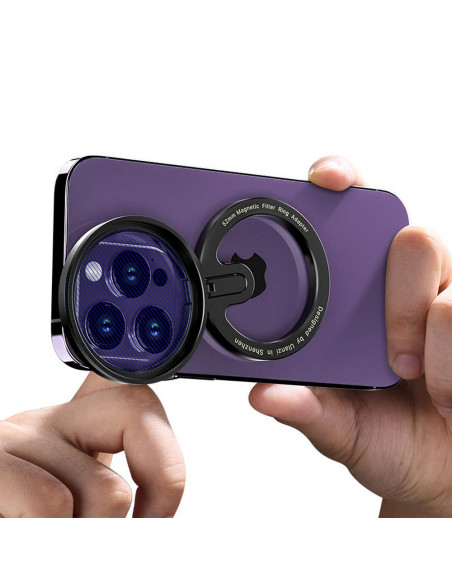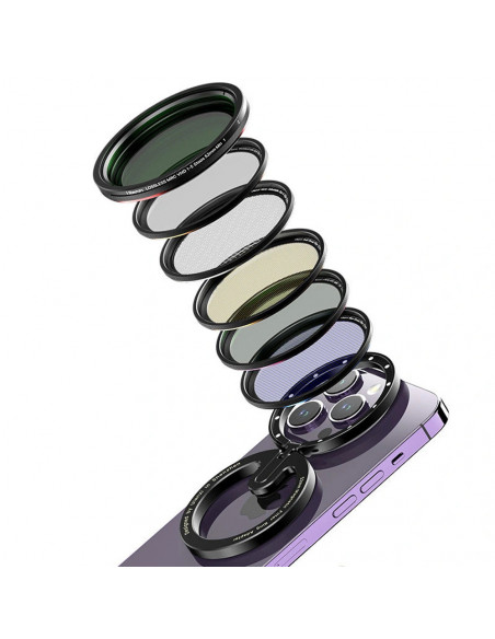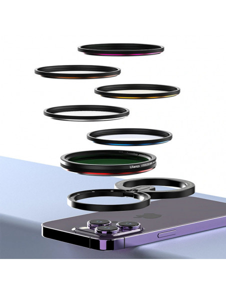 Enjoy the creative possibilities The Ulanzi HP 013 Mag Filter Magsafe Lens is a set is specifically for use with your smartphone. It is compatible with MagSafe enabled smartphones and cases, such as iPhones with MagSafe functionality or smartphones with MagSafe cases. Its magnetic convenience allows you to quickly switch between filters. Highlights A set consisting of 6 filters More creative possibilities Magnetic convenience Magnetic convenience Swap filters quickly. You can stack them for combined effects. Magnetic CPL filter Eliminate reflections on water, glass and non metallic surfaces for more vivid landscapes with the CPL filter, for brighter images, more detail and better colour saturation. Magnetic variable ND filter It offers adjustable neutral density (1 5 stops), reducing the amount of light entering the lens to capture silky smooth object movement without affecting colour. Magnetic gold and blue silky filter Silky light effect to effortlessly create a vintage atmosphere. Magnetic 1/4 Black Soft Focus Filter Reduces contrast for a soft image effect when taking portraits and landscape photos. Magnetic star filter with four lines Add a star shaped effect to point light sources for a creative romantic, dreamy mood. MagFilter magnetic filter adapter ring An aligned design with magnetic attraction, securely attaches to the MagSafe magnet, preventing falls. Professional German glass Leading German optical glass for better sharpness, extra protection, low colour aberration and easier cleaning., Set of 6 filters One filter adapter Magnetic attachment Professional German glass , 1 x MagFilter Magnetic Filter Adapter Ring 1 x Magnetic CPL Filter 1 x Magnetic Variable ND Filter 1 x Magnetic Gold Silk Filter 1 x Magnetic Blue Side Filter 1 x Magnetic 1/4 Black Soft Focus Filter 1 x Magnetic Four Line Star Filter 1 x Storage case