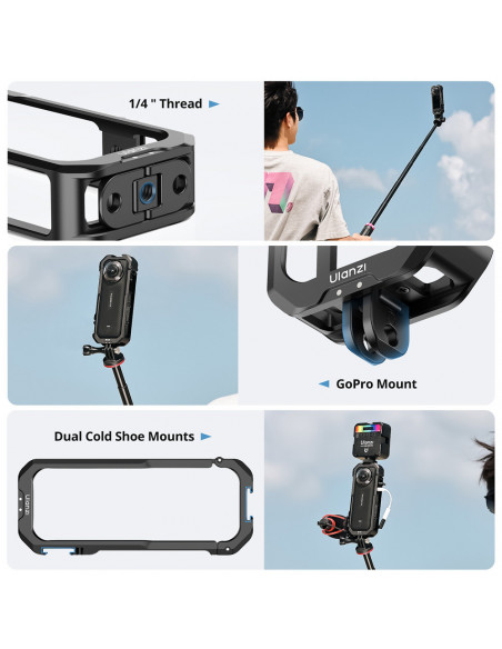 Insta360 X4 camera cage Designed for the Insta360 X4, Ulanzi IN 04 Mental Camera Cage for Insta360 X4 provides added protection and versatility during shooting. The cage offers multiple mounting options for accessories, such as microphones and lighting, and supports both horizontal and vertical shooting. Highlights Simple mode switch Multiple interfaces Quick installation All round protection Designed for any scenario Designed for Insta360 X4, allowing you to unleash your creativity with different accessories. In addition, the camera cage allows easy access to the battery and memory card without removing the camera from the cage, promoting ease of use. Vertical and horizontal mode for more angles Supports horizontal wide angle shots and vertical panorama shots for a wider perspective. Vertical and horizontal mode for more angles and features a 1/4â Arri connection pin. Wide compatibility for versatile use Multiple interfaces around the frame allow for versatile applications between different accessories. It features ¼â threads, two cold shoe connectors and a Gopro mount. Lightweight and protected Weighs only about 52 grams, ideal for travelling on the go. The inside features silicone pad for extra protection and with the internal anti collision design offers extra protection., Material: Aluminium, stainless steel, rubber, magnet Dimensions: 57.2 x 136.5 x 22 mm Weight: 52 g Carrying capacity: 2 kg , 1 x Ulanzi IN 04 Mental Camera Cage for Insta360 X4 1 x Silicone lens protector