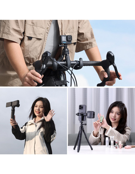 Flexible legs Weight: 252 g Maximum length: 264 mm Loads up to 1.5 kg Compact design Non slip feet , Go Quick II Flexible tripod The Ulanzi Go Quick II is a flexible tripod designed specifically for action cameras. It is ideal for vloggers and adventurers looking for a reliable and flexible solution for their action camera. Highlights Flexible tripod for different shooting scenarios. Loads up to 1.5 kg Easy to carry 360º panoramic rotation Easily adjust your camera to different angles with the 360º panoramic ball head. Flexible legs The flexible legs can be adjusted to rotate around objects in different shooting scenarios. Loadable up to 1.5 kg The JJ01 has reinforced legs together with non slip rubber feet which prevents your device from falling over. Easy to carry It is light enough to carry in your hand luggage. It has a length of 264 mm and a weight of 252 g., 1 x Ulanzi JJ01 Go Quick II Flexible Tripod for GoPro