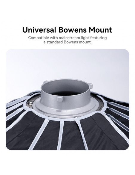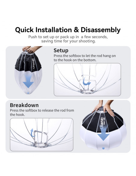 Lantern softbox with universal bowens mount The Ulanzi LAS005 65cm Lantern Softbox with Universal Bowens Mount is a versatile and easy to use softbox designed for photographers and videographers who need high quality light diffusion. Thanks to the Bowens Mount system, this softbox is compatible with a wide range of studio lights. The round lantern shape provides 360 degree light diffusion, contributing to soft, even lighting without harsh shadows, ideal for portraits and video productions. Highlights Quick installation and removal Universal bowens mount 360 degree light diffusion Quick installation and removal The softbox has a diameter of 65 cm, providing ample coverage, and is designed for both indoor and outdoor shoots. Its light weight of about 1110 grams makes it easy to carry. Its simple and quick system means it can be set up or packed in seconds, saving you time., Weight: 946 g Dimensions: 65 x 55 cm Folded dimensions: 81 x 18 cm Mounting: Bowens mount , 1 x Ulanzi LAS005 65cm Lantern Softbox with Universal Bowens Mount 1 x User guide 1 x Carrying bag