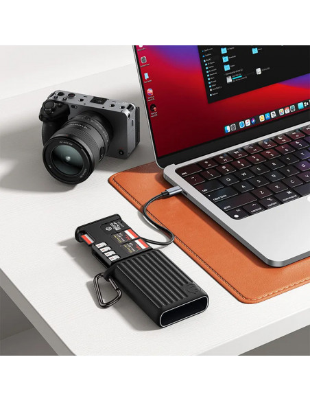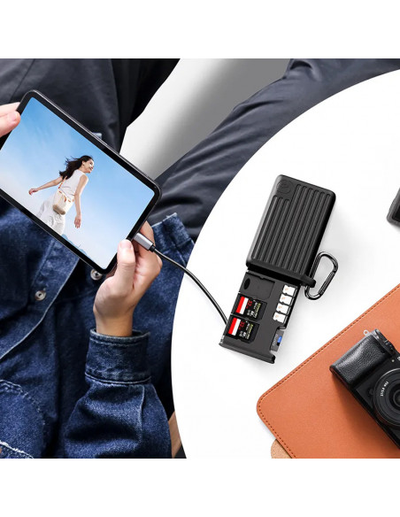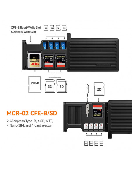 Store and transfer in one Say goodbye to clutter! The Ulanzi MCR 02 Multifunctional High Speed Card Reader Casecombines a storage case and a high speed card reader for seamless file management. Highlights Speed up your workflow Organised storage for ultimate efficiency Dual slot power optimised for speed Speed up your workflow Powered by a USB 3.2 Gen2 chip, this device provides lightning fast transfers at 10Gbps speed, up to 1000MB/s for CFexpress cards and 312MB/s for SD 4.0 UHS II/Micro SD(TF) cards effortlessly handling your data needs. Organised storage for ultimate efficiency With double sided storage, this case has dedicated slots for storage and a spacious, well organised layout that keeps everything neat and accessible. MCR 02 CFE B/SD; 2 CFexpress Type B, 4 SD, 4TF,4 Nano SIM and 1 card injector Dual slot power optimised for speed With dual read/write slots for CFexpress and SD cards, this device supports fast read/write operations, prioritising CFexpress for seamless performance. High speed micro SD (TF card) to SD card adapter Supports SD4.0 spec Micro SD (TF card) cards with a theoretical transfer speed of up to 300MB/s. It is UHS II compatible for reading and backwards compatible with UHS I and non UHS SD and Micro SD (TF card) cards. Instant sharing with Type C cable Instant transfer is only supported on Type C devices with OTG functionality (smartphones/tablets/computers). When connecting to a desktop computer, a Type C to USB A adapter is required (sold separately)., Model: MCR 02 Material: Aluminium alloy + ABS + Silicone Dimensions: 110.2 x 81.7 x 26.4 mm Weight: 205 g Input: USB 5V/2A (Max) Compatibility: Windows 7 and later Mac OS 10.6 and later Linux, Android, iPad OS , 1 x Quick card reader 1 x Carabiner 1 x Silicone case 1 x Card ejector 1 x Micro SD to SD adapter 1 x User guide