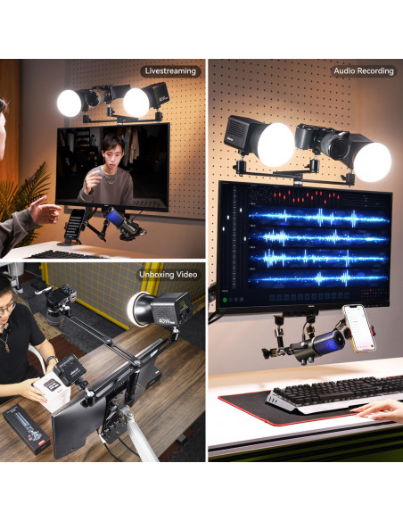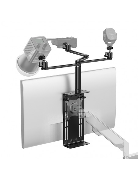 Free up workspace The Ulanzi Monitor VESA expansion bracket is designed to add extra functionality to monitors that support a VESA mount (75x75 mm or 100x100 mm). It provides a platform to mount additional equipment, such as cameras, lights, microphones, or other accessories. Suitable for monitors from 17 to 34 inches, this bracket comes with mounting hardware such as screws and ball head adapters for flexible setups. Highlights Universally compatible with VESA display mounts Suitable for monitors from 17 to 34 inches Load capacity of up to 4 kg Free up workspace for integrated rear panel This extension is ideal for people who want to maintain a sleek workspace and make their monitor multi functional, for example for video conferencing, streaming, or content creation. Easy to mount on monitors and adjustable for different setups. Compatibility Universal Compatible with VESA display mounts of 75x75 mm and 100x100 mm, perfectly fitting 27 inch screens. Shoot from any angle with 360° rotation and flexible up and down. Durable Made of durable aluminium alloy, this monitor stand can support devices up to 4kg. Multi purpose use It features multiple 1/4â screw holes and mounting holes on the back panel for attaching your accessories., Material Aluminium + silicone + plastic Weight: 700 g Dimensions: 436 x 348 x 57 mm Load capacity: up to 4 kg , 1 x rear panel 1 x stand 3 x 1/4â Ball Head 3 x 1/4â Screw 4 x Flat screw 4 x Nylon Spacer 3 x Screw for extension pole 2 x Allen key