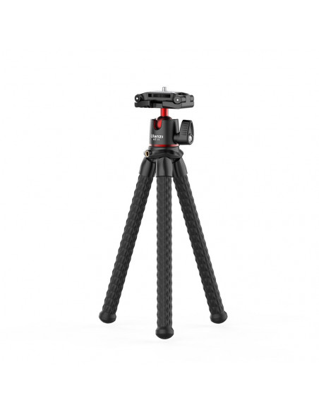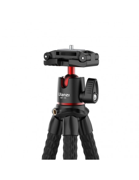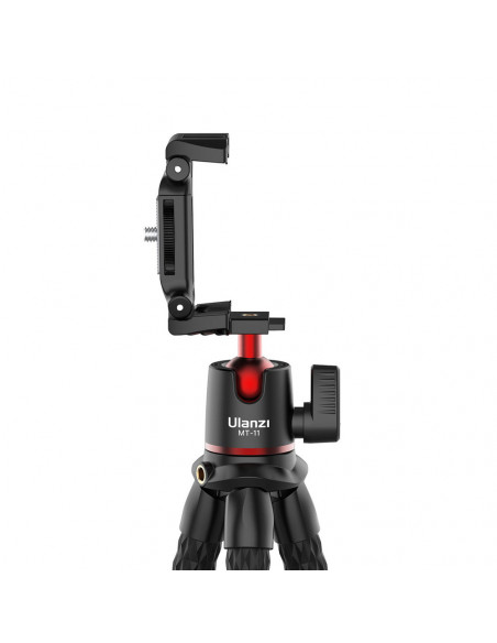 The multi functional tripod The Ulanzi MT 11 Multi functional Octopus Tripod for Camera & Smartphones is suitable for your camera, actioncam, smartphone or tablet. The tripod is easy to put down or hang thanks to its flexible rubber legs. You simply bend the legs into the desired shape. This way, you can easily attach the tripod to a branch or tube. This tripod is ideal for vloggers! Highlights Flexible rubber legs Built in phone holder Compatible with phone and camera Adjustable ball head Versatility Thanks to its flexible legs, this tripod can be used on a variety of irregular surfaces. The rubber feet give the tripod extra grip on slippery surfaces and, despite its 400 grams, it can support a weight of 2 kg. Attaching accessories The cold shoe at the top fits a light, microphone or other accessories. Folded down, the phone holder serves as a tripod head, for a compact or system camera, for example. The head also includes a small spirit level so you can check whether your smartphone or camera is level., Load capacity: 2 kg Mounting screw 1/4" 20 Length: 31 cm (collapsed) Materials: Aluminium alloy Weight: 400 g 360° adjustable ball head