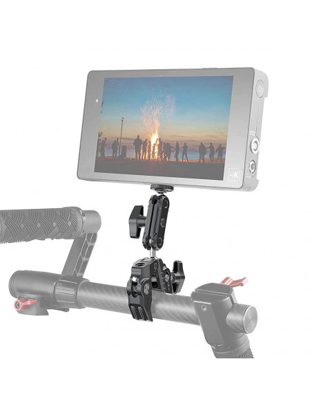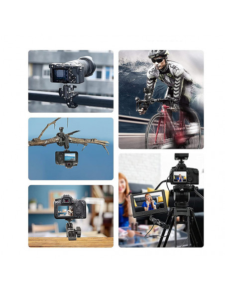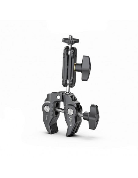 The multi functional clamp The Ulanzi R094 UURig Multi functional Super Clamp (Aluminium alloy) is a versatile clamp that can be used for attaching camera accessories. With its slip resistant clamps and wing nut fasteners, it is quick and easy to use. Highlights Mounts on surfaces up to 6 cm wide 2.6" ball head arm, loadable up to 1.5 kg 360° Mini ball head at both ends 1/4" 20 & 3/8" 16 mounting bolts Slip resistant clamps and wing nut fasteners The clamp has 2.6" ball arm and has a load capacity of up to 1.5 kg with has a 1/4" 20 thread. The clamp arm has a 360° mini ball head at each end, so you can position your accessory at almost any angle., Suitable for Camera, Action Camera/GoPro, smartphone (mount), Accessories with 1/4 or 3/8" screw (hole) Maximum tube thickness 6 centimetres Material aluminium, Non slip rubber Dimensions 10.0 x 11.0 x 4.0 cm Weight 180 grams , 1 x Ulanzi R094 UURig Multi functional Super Clamp (Aluminum alloy) 1 x Gopro adapter
