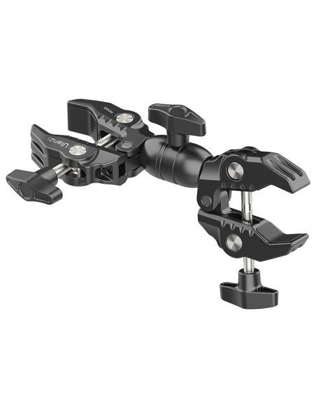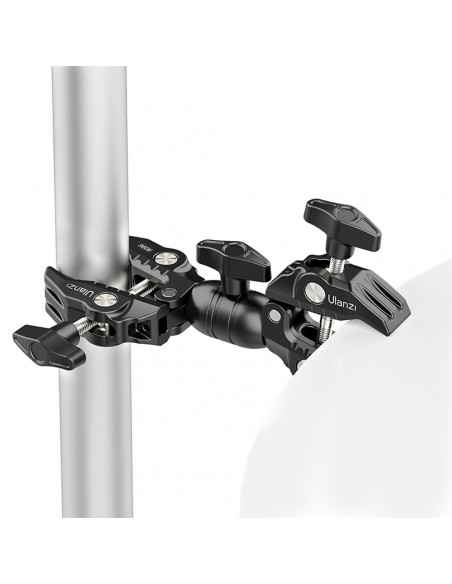 Dual Head Rod Clamp The Ulanzi R096 Dual Head Rod Clamp with ball head consists of two clamps connected by a centre post. Each clamp rotates 360° and has an opening range of 13 to 60mm. The non slip pads provide more grip and protect the gripped surface or part. Highligths 2 clamps with T handles 360° rotatable 13 to 60 mm clamping range Versatile use This double clamp has a load capacity of up to 1.5 kg and can be used to attach a selfie stick, umbrella or other accessory to a rail, table or other surface., 2 klemmen met T grepen Middenstijl met 360° rotaties 13 tot 60mm klembereik Antislip pads Ondersteunt tot 1.5kg Materiaal: aluminiumlegering