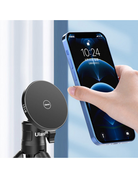 Strong magnetic, one touch shooting The Ulanzi R101 1/4" Mount for MagSafe iPhones offers a stable magnetic mount and has a universal 1/4'' screw hole to quickly attach to a tripod or selfie stick, allowing you to effortlessly capture stable images. Highlights Suitable for the iPhone 12 and 13 series Universal 1/4'' interface Integrated non slip silicone surface to prevent scratches The MagSafe magnet is suitable for the iPhone 12 and 13 series, but non MagSafe models can also be used with a magnetic phone case or magnetic ring. You can easily adjust and rotate your phone 360°. With the integrated non slip silicone surface, it prevents scratches., Material: Aluminium and silicone Weight: 64.5 g Diameter: 60 mm Suitable for iPhone 12 and 13 series or magnetic phone case/magnetic ring , 1 x Ulanzi R101 1/4" Mount for MagSafe iPhones