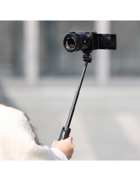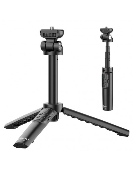 Stable, flexible and wireless The Ulanzi RMT 01 Vlog Wireless Remote Control Tripod is made of durable aluminium alloy and has a 1/4" 20 thread for attaching accessories. The RMT 01 Vlog Wireless Remote Control Tripod has wireless bluetooth control integrated into the handle. It is compatible with mirrorless cameras, digital cameras, camera cages, smartphone holders, action cameras weighing up to 1.5 kg. Highlights Portable and stable Wireless bluetooth control Maximum height of 184 cm Portable and stable Compact and easy to take anywhere, the RMT 01 Vlog Wireless Remote Control Tripod has a maximum height of 184 cm. It is made of durable aluminium alloy and the legs firmly on the ground. With integrated bluetooth control with 3.7V/90mAh battery and Type C charging port, you can take photos, zoom and record making it ideal for vlogging. 180 degree swivel The RMT 01 Vlog Wireless Remote Control Tripod has a 1/4" 20 threaded mount for attaching accessories. Once attached, they can be positioned at a 180° angle. , Portable and stable Length: 184 cm Load capacity up to 1.5 kg 1/4" 20 threaded attachment Dimensions: 37 x 33 x 164.5 mm Weight: 115g Communication range: 10m Battery: 3.7V/ 90mAh Charging port: 5V/1A (Type C) Charging time: â¤90min , 1 x Ulanzi RMT 01 Vlog Wireless Remote Control Tripod