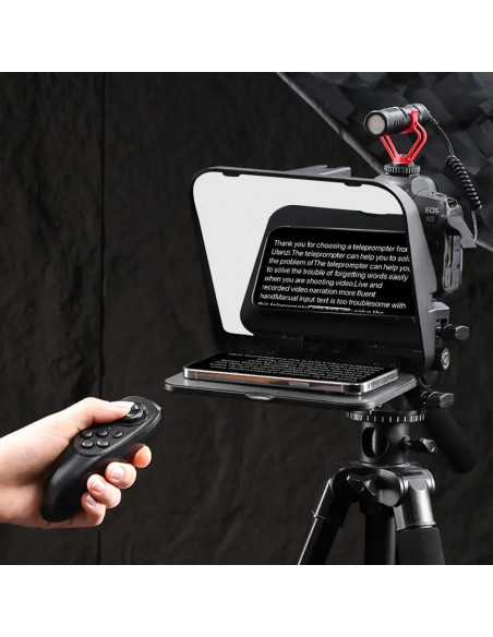 Different scenes, easy to handle The Ulanzi RT02 Foldable Teleprompter is designed for content creators and for efficiency and improvement when making videos. It features clear prompter function so you don't have to remember anything, ensuring you always have a smooth and natural presentation. Highlights Compatible with phones and tablets Adapter ring for camera lenses Bluetooth remote control Compatible with phones and tablets The RT02 Foldable Teleprompter offers stable placement for phones and mini tablets up to 6 inches. The quick release phone clip lets you switch between modes efficiently. Press the button, remove the outer cover from the mounting port, align and click to switch to phone mode. No light leakage The dampening folding panel is easy to open and close, gives tight coverage with no gaps and no light leakage into the camera lens. Adapter ring for camera lens The RT02 Foldable Teleprompter is equipped with 58/67/72/77/82 mm adapter rings, making it suitable for most camera lens sizes. Personalised extension The RT02 Foldable Teleprompter has a cold shoe attachment and a 1/4 inch threaded hole, so you can attach external accessories such as lights, microphones, desk stands and tripods. Bluetooth remote control Make operation easy with the with bluetooth remote control. Use the APP teleprompter and you can easily remotely scroll quickly, turn pages, adjust speed, change font and background colour., Compatible devices: Phone/Camera/Laptop Size of autocue: 18.8 x 17.8 x 10.3 cm Weight Teleprompter: 465.5 g Supported Prompting area: 19 x 12 cm Phone adapter dimensions: 15.3 x 10.8 x 3.1 cm Net Phone adapter weight: 80.3 g Phone Clamp Range: 55 mm 80 mm Material: ABS, PC, Glass and Rubber Packaging Dimensions: 30 x 20.3 x 12.3 cm , 1x Ulanzi RT02 Foldable Teleprompter 1 x Remote Control 1 x Phone Adaptor 5 x Adapter Rings 2 x Circular Lens Shade Sponge 1 x Dustproof Cloth 1 x User Guide