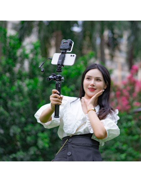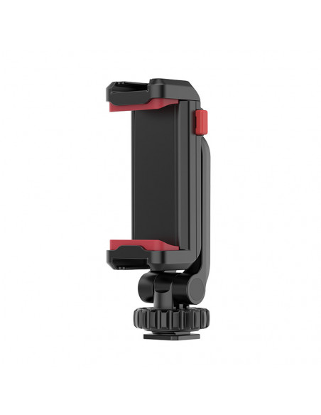 Multifunctional phone holder The improved Ulanzi ST 06S Cold Shoe Phone Holder with additional cold shoe attachments has a stylish design and sturdy construction for improved functionality and comfort. The base features a cold shoe with an integrated 1/4" thread, so you can attach it to the top of your digital camera, atop a tripod or selfie stick. Highlights Multifunctional phone holder Additional cold shoe attachments Push and Lock system Additional cold shoe mounts The dual cold shoe allows both microphone and LED video light to be attached at the same time, enhancing your vlogging or video quality. The 360° swivel design supports both horizontal and vertical shooting angles. Compact and portable Weighing only 51g and measuring 105mm, it is easy to carry in any bag, with a silicone pad in the mobile phone holder to protect your phone from scratches. Push and Lock system Push and lock by simply pressing the button. Press the button to open the clamp, place your phone and push the clamp closed again. The ST 06S Cold Shoe Phone Holder works with almost any smartphone., Compact and lightweight design Dual Cold Shoe & 1/4" Connection Supports 2.4 to 3.5" wide smartphones Easy operation with ratchet clamp Rotate 360° and tilt 180° Protective non slip silicone pads , 1 x Ulanzi ST 06S Cold Shoe Phone Holder