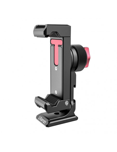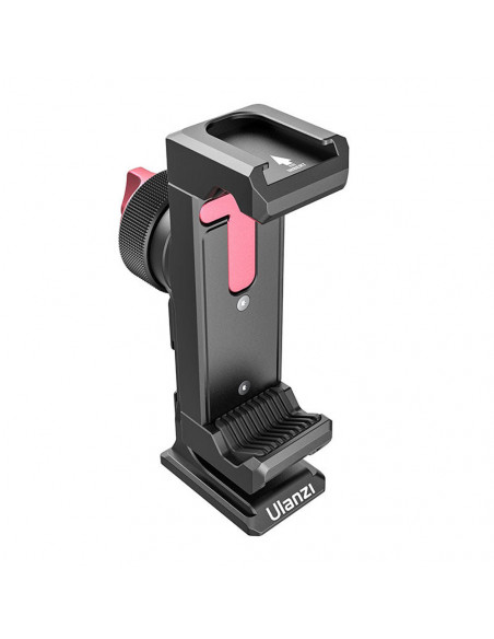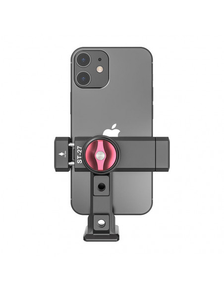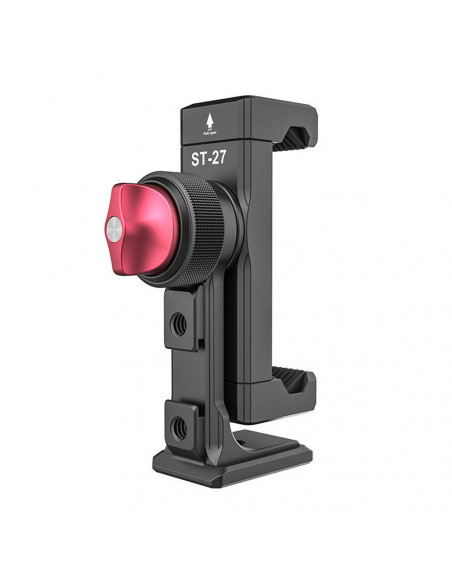 For all your accessories The Ulanzi ST 27 Iron Man IV Smartphone Clip is your ideal partner for additional accessories. With a cold shoe on the top, bottom and back and three ¼â threaded connections, you can go either way. The clip is suitable for any smartphone with a width between 60 89 mm. Ideal for filming stable vlog videos for Facebook, YouTube and other platforms and live streaming channels. Highlights For 60 89 mm wide smartphones, also works on selfie sticks or monopods. 360° Rotation Rotary knob with locking ring Angled holders with non slip Silicone 360 Rotation An integrated dial on the back of the holder allows you to easily rotate it and adjust the orientation of your phone. It can rotate 360° and is held in place by the knurled locking ring., Model: ST 27 Material: Aluminum alloy Clip distance: 60 89mm Weight: 123g 3 x Cold shoe attachment, 3 x 1/4â threaded connections , 1 x Ulanzi ST 27 Iron Man IV Smartphone Clip