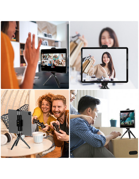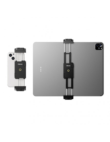The universal holder for smartphone and iPad The Ulanzi ST 29 Holder for Smartphone and iPad is a handy accessory you can use for your phone or tablet. It is lightweight and easy to carry. Highlight Suitable for most smartphones and iPads up to 12.9 inches Use it vertically or horizontally Guide the charging cable through the recess Versatility The holder can be attached to an optional tripod via the two 1/4" 20 screw holes, for both vertical and horizontal use. The holder can also be used without a tripod on a flat surface. The top is designed with a cold shoe interface, allowing you to extend it with a microphone, fill in light or other accessories. Easy loading The holder has a plastic construction and silicone pads on the top and bottom that keep your smartphone or iPad securely in place. The holder has a recess where the charging cable can be passed through, which is very convenient while charging., Length: 9.2 cm Clamp opening: 6.7 to 22.5 cm Material: ABS plastic ¼" screw holes and cold shoe interface , 1 x Ulanzi ST 29 Holder for Smartphone and iPad