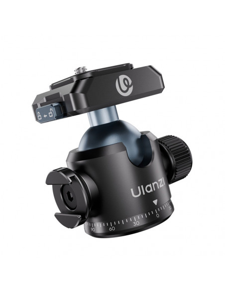 Easily capture every angle The Ulanzi T100 Uka Tripod Ballhead combines speed, flexibility and stability in one compact head. Thanks to the four way quick release plate, you can mount your camera quickly and flexibly, while the built in safety lock ensures that your equipment always stays securely in place. Highlights Uka quick release Maximum load capacity: 6 kg ¼â and 3/8â screw thread 360º adjustable cold shoe For unlimited angles The fully adjustable ball head construction allows you to work from any angle, ideal for both wide panoramas and creative perspectives. With the U shaped slot and sturdy locking knob, you can effortlessly switch between portrait, landscape or oblique angles, always smoothly and stably. Sturdy support up to 6 kg The head is made of durable CNC aluminium and can carry a load of up to 6 kg, allowing it to support heavy lenses without compromising reliability. Extra versatile For added versatility, there is a 360° rotatable cold shoe, perfect for mounting a microphone or video light. The included 1/4â to 3/8â adapter ensures universal compatibility, while silicone gaskets keep your setup secure and tight. Thanks to the non slip silicone pads, everything remains stable and your equipment is well protected., Model: T100 Dimensions: 69 x 60 x 75 mm Weight: 195 g Material: Aluminium Load capacity: Max. 6 kg , 1 x Ball head 1 x ¼â to 3/8â adapter 1 x Flat wrench 1 x Allen key