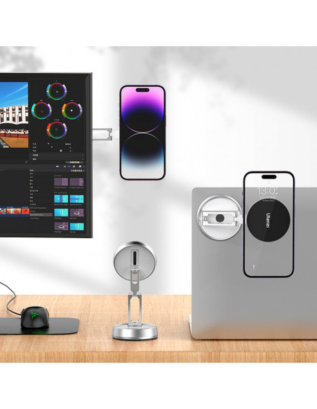 The magnetic phone holder with suction base This Ulanzi TB13 Magsafe Foldable Holder foldable magnetic phone holder with suction base is easy to carry. Use it on your car window or on your laptop or monitor or attach it to your desk. It has a small size and weighs less than 100g and is easy to carry. Highlights Strong suction, firm and residue free Compatible with most phone models Flexible adjustment as required Strong suction, firm and residue free The Nano suction cups can be repeatedly disassembled and washed, firmly attached without leaking by pressing and turning the base to lock. Click and stick MagSafe magnetic suction function ensures smooth attachment and alignment. Compatible with most phone models It is compatible with iPhone 12/13/14 series, phone cases with MagSafe function, phones or cases with magnetic patches. Flexible customisation It has a sliding design, you can fold it in two stages androtate it into three parts. It easily meets your different needs., Model: TB13 Material: Aluminium alloy, ABS+PC, TPU Weight: 98 g Dimensions: 186 x 65 x 27 mm Storage size: 76.5 x 65 x 30 ± 3.5 mm Magnetic force: 10N for bare phone, 12N for magnetic patch , 1x Ulanzi TB13 Magsafe Foldable Holder 1x magnetic patch
