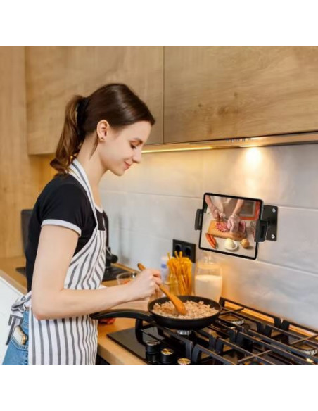 Tablet Wall Mount Holder Do you use a smartphone or tablet measuring between 4.6 and 13 inches? This Ulanzi TB58 Wall slab bracket holds them securely in place, from small phones to large tablets. Perfect for mounting on the wall. Securely attach the holder to the wall using the screws provided. Highlights Suitable for smartphones and tablets measuring between 4.6 and 13 inches Durable aluminium alloy with scratch resistant rubber pad Rotate and tilt as you wish Sturdy and scratch free The holder is made of aluminium alloy with a sleek finish. The soft rubber pad in the clamp prevents scratches. This keeps your device safe and undamaged, no matter how often you use it. Rotate and tilt as you wish With the double ball head, you can rotate and adjust the holder to any angle you want. Ideal for finding the perfect viewing position, whether you're watching videos, following cooking instructions or working with digital content., Free 360 degree rotation with double ball head for flexible angles Easy to mount with four screw holes (screws included) Can be mounted on the wall