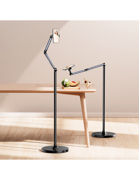 Overhead floor stand for smartphone The Ulanzi TH07 Phone Holder is a robust and flexible accessory that lets you shoot creatively with confidence and ease. Highlights Two flexible arms Flexible angle adjustment Maximum height of 1.45 metres Two flexible arms Easily adjustable for any angle 360° rotation The phone holder is fully rotatable and supports both horizontal and vertical shots. Maximum height of 1.45 metres Suitable for various applications, from product photography to making vlogs. Solid iron base The solid base with a diameter of 26 cm prevents wobbling or tipping over. Silicone pad: Provides extra grip and prevents your phone from falling out of the holder. Non slip carbon steel base Protects the floor from scratches. Flexible angle adjustment Thanks to the highly flexible arms and universal joints, you can effortlessly adjust the stand to suit your shooting needs, whether you want to film overhead or from a low angle., Material: Aluminium alloy, ABS and iron Weight: 2185 g Base height: â260 mm Compatible phone size: Up to 6.5 inches Phone clamp width: 60 92 mm Maximum height: 1.45 m , 1 x Base 1 x Carbon steel tube A 1 x Carbon steel tube B 1 x Adjustable arm 2 x Allen keys 1 x Screw for base mounting 1 x Phone clamp 1 x User guide