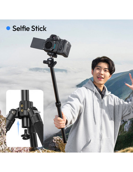 The tripod that effortlessly follows your adventures The Ulanzi TT53 Uka Lightweight Mirrorless Tripod (1.8m) versatile selfie stick and tripod combines an ultra light, foldable design with maximum performance. Thanks to the Uka Quick Release system, you can switch devices in seconds. With 360° rotation and ±90° tilt, it offers complete panoramic control. The sturdy construction supports devices up to 3 kg, ideal for reliable outdoor shooting. Adjustable to a height of 180 cm, with endless positions for every shooting need. Highlights Foldable design for compact storage, ultra light for easy transport. Uka Quick Release, switch devices in seconds. 360° horizontal rotation ±90° tilt, full panoramic angle adjustment. 3 kg safe load capacity, reliable performance for outdoor shooting. Extendable to 180 cm full height with infinite adjustable positions. Height adjustable The four section legs and two section centre column offer flexible height adjustments up to 180 cm, allowing you to meet all your creative needs for high and low angles. Folded height (with centre column not extended): 52 180 cm Extended height (with centre column extended): 103 180 cm Reversible, foldable and light for travelling The TT53 has a reversible foldable leg design and is made of durable aluminium alloy and ABS plastic, making it highly portable for travelling. Strength you can rely on The head of the TT53 tripod is made of aluminium alloy and can carry up to 3 kg, while the legs can carry up to 8 kg, ensuring stability for every shot. The included ball head supports up to 3 kg. Switch faster, create smarter The tripod is compatible with both Uka and F38 quick release plates, allowing you to switch seamlessly between devices. Capture more with your preferred mode Switch effortlessly between modes to take low angle shots or remove the centre column to transform the tripod into a selfie stick. Adjustable in all directions The ball head allows for smooth 360° rotation and effortless transitions from portrait to landscape, so you can capture the perfect shot every time. Effortlessly expand your possibilities With side mounted 1/4" and Arri positioning holes, you can expand your setup with magic arms to attach accessories such as phone clamps, video lights and microphones. The leg angles can be set at 23°, 53° and 83 degrees, and the foam rubber handle provides a comfortable grip. The counterweight hook ensures safe, wind resistant performance., Materials: aluminium alloy + ABS plastic Weight: 1.2 kg Dimensions: 10 x 8.5 x 43 cm Extended height (selfie stick mode): 43 66 cm Extended height (tripod mode): 52 180 cm Centre column: 2 Legs: 4 Ball head load capacity: 3 kg Tripod load capacity: 8 kg , 1 x Ulanzi TT53 Uka Lightweight Mirrorless Tripod (1.8 m) 1 x Storage bag 1 x Wrench