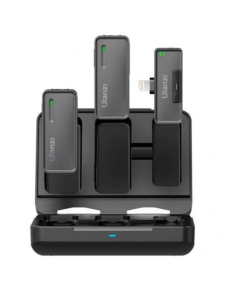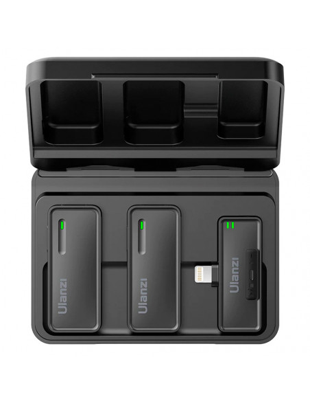 Always reliable recording The Ulanzi UW MIC 2.4GHz Wireless Recording Microphone Lightning 2 in 1 has internal microphone has an omnidirectional recording pattern that ensures reliable voice recording even when the microphone placement is not ideal; your subject's voice is recorded crisply, clearly and consistently. Highlights Reliable and secure wireless with encryption High quality audio with flexibility for post production Easily transforms into a recorder Portable microphones For a truly wireless experience, easily attach a transmitter to whatever you're wearing via the integrated clip on the back, without having to wire yourself or your talent. You can also hold the transmitter in your hand and use it as a handheld microphone. High quality audio with flexibility for post production The Ulanzi UW MIC lets you record high fidelity, professional audio by accurately reproducing tone across a wide frequency range. To make sure you record a clean signal, you can monitor the audio via the receiver's 3.5mm headphone output while recording. Easy to transform into a recorder Both transmitters have a built in recording function for up to 8 hours of backup recording. This allows you to record audio directly to each transmitter as a backup in case of wireless interference and outages. You can also use the transmitters as standalone recorders. (Tip: TF card is not includedï¼ Reliable and secure wireless with encryption The Ulanzi UW MIC is capable of recording clear audio at distances of up to 100m/ 328ft using Ulanzi's encryption technology for secure communication. Easy to operate No APP required. Just plug the receiver into the phone to connect. Three levels of intelligent noise reduction Uses a noise reduction algorithm to effectively filter out ambient noise and provide a clear human voice, no matter if it is a noisy street or windy weather. A whole day of audio recording The microphone's battery lasts up to 8 hours and can be charged at any time. Convenient Type C charging port, no more worrying about battery life for outdoor recording Official MFi Apple certification, Colour: Black Weight: 140 g Material: ABS Transmission distance: 100 m Sound delay: â¤25ms Headphone monitoring: Support Transmitter battery capacity: 230mAh Rechargeable housing battery capacity: 1500mAh Input voltage: 4.8 5.4V Signal to noise ratio: 64dB , 1 x charging case 2 x microphone 1 x receiver 1 x double sided headphone cable 1 x charging cable 2 x windscreen 1 x User guide