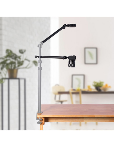 Create a compact professional studio The Ulanzi VIJIM LS04 Extension Frection Arm for Desk Mount Stand is a two piece tripod arm designed for VIJIM LS series tripods, but it also fits all other tripod legs and tubes from 18 to 28 mm in diameter. The arms are 25.5 and 35.5 cm long and non extendable and can be used separately. They have a maximum loadable weight of 1kg. Highlights For VIJIM LS series For cameras or accessories Max. loadable weight of 1kg Swivel and tiltable ball heads Both parts of the arm have a 360° rotatable and 120° tilting ball head with a universal 1/4Ⳡscrew. On these ball heads you can mount a camera or an accessory such as lamp, microphone, smartphone etc. Possibilities of the VIJIM arm The VIJIM LS04 is ideal for taking images from above, such as top shots and product photos or in places where you cannot use large tripods. And it's also easy to transport. It is also perfect for adding accessories such as lights or microphones or as a tripod. Suitable for This VIJIM tripod arm is specially designed as an accessory for the VIJM LS Series tripods, such as the LS01, LS02, LS03, LS08, LS11 but it also fits perfectly on the Ulanzi Desktop Stand with 1 arm or 3 arms. It also fits all other tripod legs and tubes with a diameter of 18 to 28 mm., Both parts with ball head For VIJIM LS series Fits 18 28 mm tripod legs/tubes For cameras or accessories Arms are 25.5 and 35.5 cm long Max. load weight of 1 kg , 1 x Ulanzi VIJIM LS04 Extension Frection Arm for Desk Mount Stand