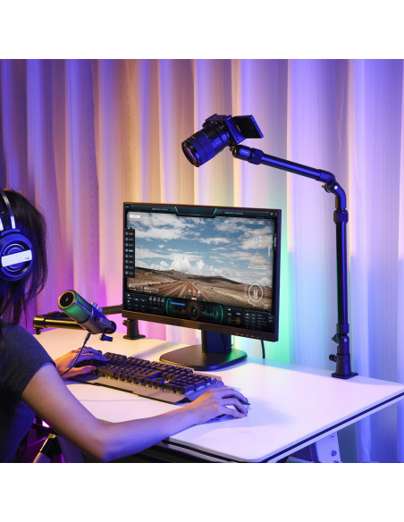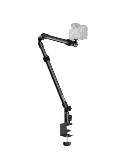 Flexible and stable solution The Ulanzi ZJ02 C clip Folding Bracket is a folding C clip bracket that can be easily attached to a table or desk. With a load capacity of up to 2 kg, this bracket is suitable for supporting cameras, smartphones and other devices. The multi hinge design allows flexible positioning, ideal for overhead shots, side views and various creative applications. Highlights Flexible adjustment Extendable up to 65 cm Loads up to 2 kg Sturdy C clamp Easily attaches to desks up to 48 mm thick with a sturdy C clamp. Flexible adjustment You can adjust the arm's toothed joints 180° to any angle and position. Extendable up to 65 cm Adjustable for different shooting angles, with a maximum height of 65 cm suitable for flat lay photography, for example. Length adjustable in 4 sections The stand is freely adjustable, with an extended length of up to 98 cm, suitable for large desks. | 1/4â ball head The 1/4â ball head offers flexible adjustments for shots Loads up to 2 kg Made of durable aluminium alloy, the bracket offers high load capacity for devices up to 2 kg., Material: Aluminium + plastic Weight: 1265 g Extended length: 123 x 2 x 48, 43 mm Load capacity up to 2 kg 1/4â ball head