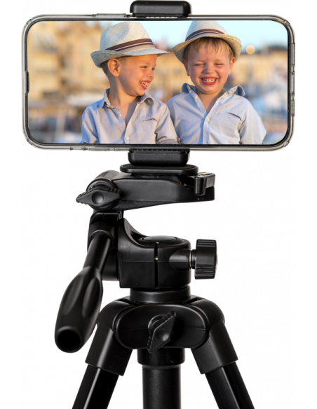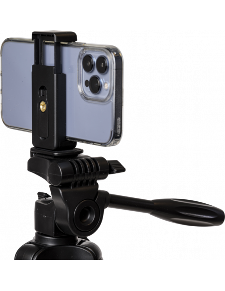 Lille fleksibel tripod fra Velbon med længde sammenklappet på 43,5 cm og en maksimal længde på 123 cm. Tripod’en leveres med et monteret panorama- og vippehoved og en smartphoneholder.Hovedet giver en jævn 360 graders panorering og håndtering, og det er nemt at skifte til portrættilstand.Stativet vejer kun 435 gram og er nemt at tage med sig. Hovedet er udstyret med en hurtig quick-release plade du hurtigt og nemt kan tilslutte og afmontere kameraet eller smartphonen.Der medfølger en bæretaske til tripod'en for nem transport.