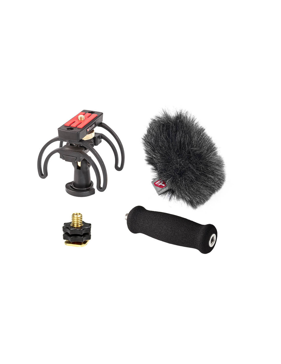A combined Windshield and Suspension solution, the kit contains everything needed to protect a handheld digital recorder from outdoor wind noise, and also to isolate it from unwanted vibrations, whether from handling or stand-borne noise. It is aimed at journalists, film-makers, or anyone using a handheld digital recorder to make professional-quality audio recordings outdoors. It can be used location soundtracks or outside broadcast, or for simple audio podcasts or outdoor radio reporting. Featuring the new 1/4" to 3/8" Swivel Adaptor, the suspension fits any portable recorder with a 1/4" female thread. The suspension can then be mounted on a 3/8" male thread, mic stand or boom pole, or be attached to a camera hot shoe. The 180° swivel allows for easy orientation of the recorder so it can point in the exact direction of the speaker Suitable for Olympus LS-05/10/11 Includes: 1 x Portable Recorder Suspension 041119 1 x Soft Grip Extension Handle 037301 1 x Hot Shoe 3/8"Adaptor 037302 1 x Olympus LS-05/LS-10/LS-11/LS-12/LS-14 Mini Windjammer 055398