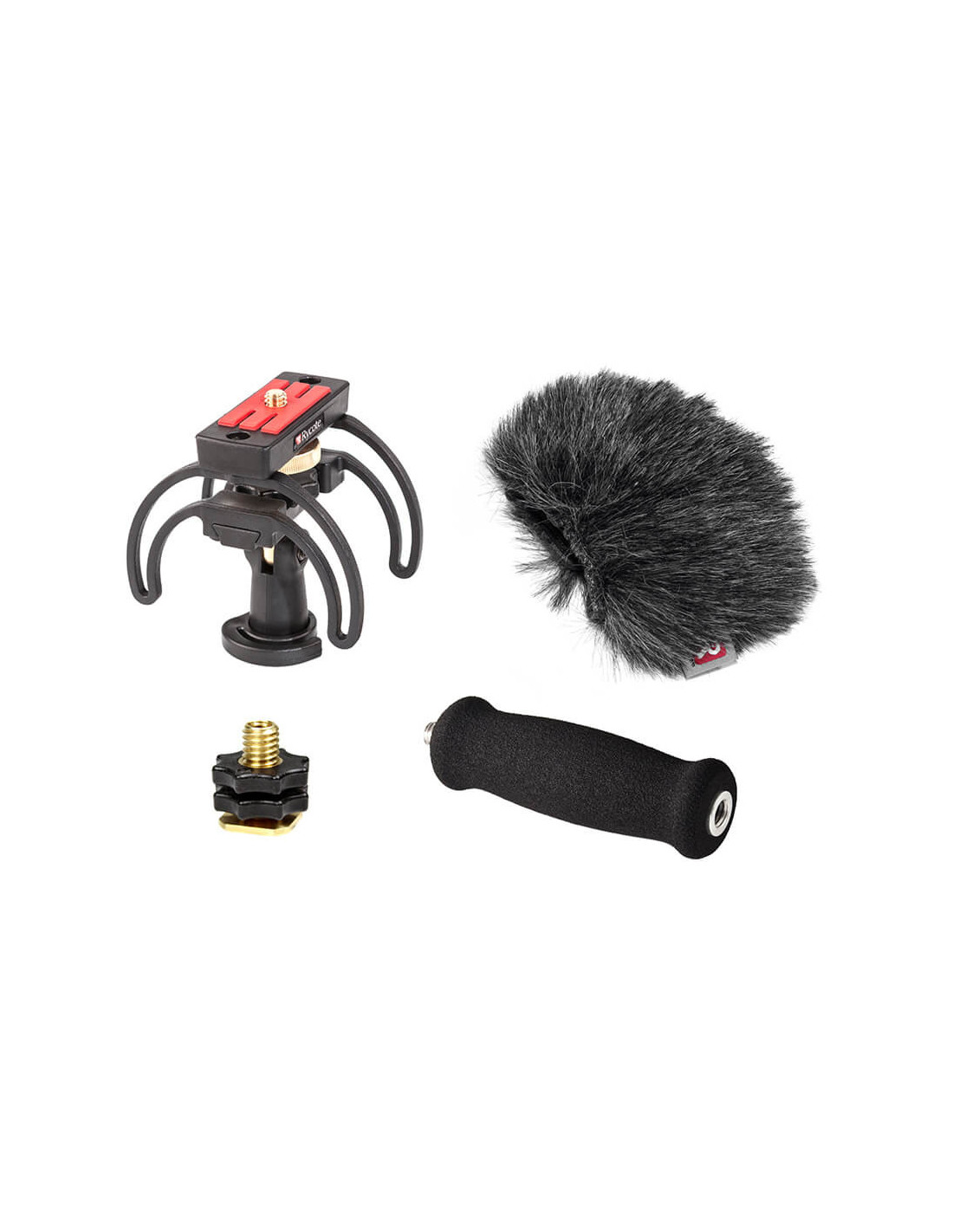 A combined Windshield and Suspension solution, the kit contains everything needed to protect a handheld digital recorder from outdoor wind noise, and also to isolate it from unwanted vibrations, whether from handling or stand-borne noise. It is aimed at journalists, film-makers, or anyone using a handheld digital recorder to make professional-quality audio recordings outdoors. It can be used location soundtracks or outside broadcast, or for simple audio podcasts or outdoor radio reporting. Featuring the new 1/4" to 3/8" Swivel Adaptor, the suspension fits any portable recorder with a 1/4" female thread. The suspension can then be mounted on a 3/8" male thread, mic stand or boom pole, or be attached to a camera hot shoe. The 180° swivel allows for easy orientation of the recorder so it can point in the exact direction of the speaker Suitable for Tascam DR-07 Includes: 1 x Portable Recorder Suspension 041119 1 x Soft Grip Extension Handle 037301 1 x Hot Shoe 3/8"Adaptor 037302 1 x Tascam DR-07 Mini Windjammer 055373