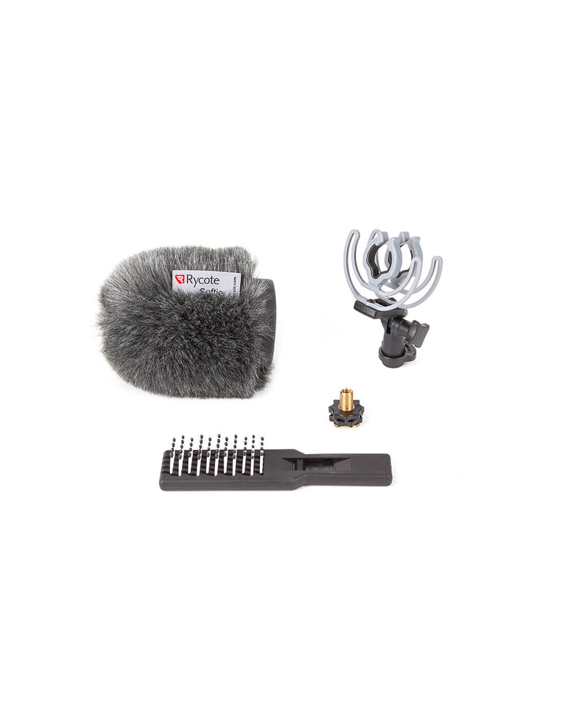 Designed for the Sanken CS-M1 microphone, the Rycote Softie Kit is a windshield and shockmount system offering reduction of wind and handling noise for videographers, sound recordists, and more. It includes a Classic-Softie slip-on windshield, an InVision INV-6 shockmount, one shoe adapter, a brush, and a Rycote sticker. Both compact and lightweight, the Softie Kit is well suited to boompole or camera-mounted applications. The supplied shoe adapter enables attachment of the Softie Kit to your camera´s hot or cold shoe. The acoustically transparent Softie Kit also protects your mic from dust and dirt. Specifications: Compatible Mic Diameter 0.748 to 0.87" / 19 to 22 mm Inner Depth 2.8" / 7 cm Fur Length 1" / 2.5 cm Outer Diameter 4.7" / 12 cm Length 3.9" / 10 cm Weight 1.3 oz / 38 g