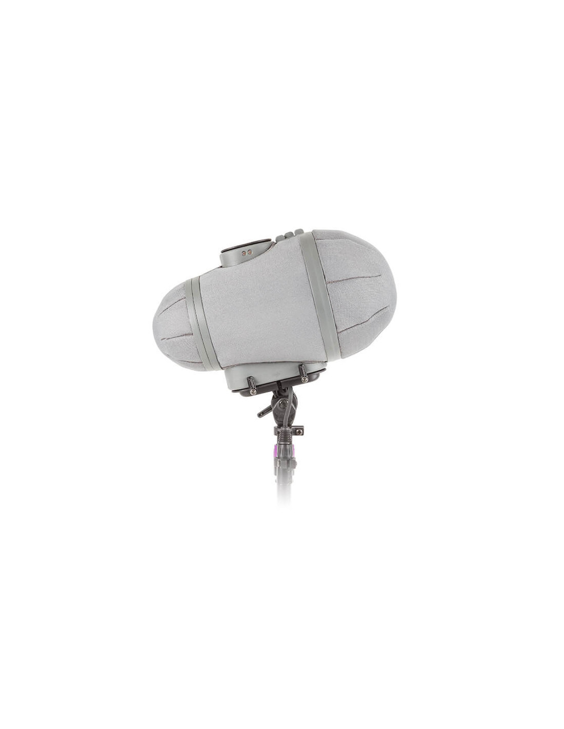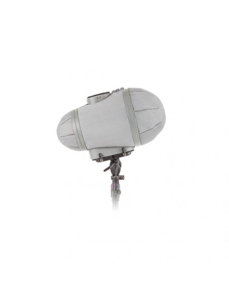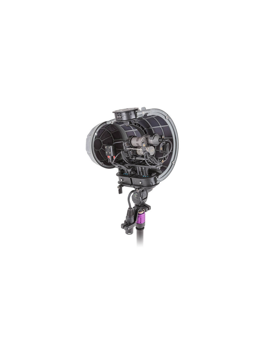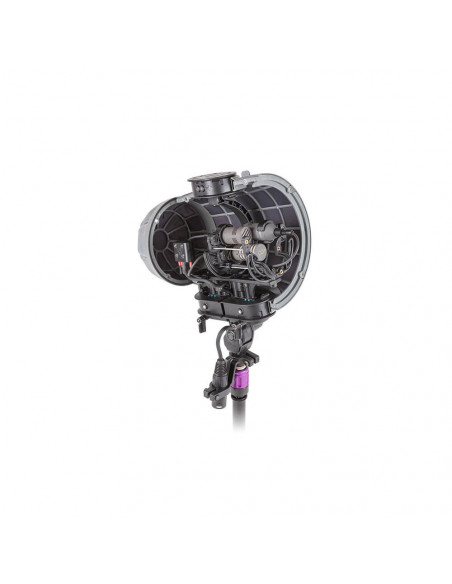 The Rycote Stereo Cyclone DMS Kit 1 is a windshield system offering acoustically transparent protection for location sound mixers and recordists using a pair of Schoeps CCM 4 microphones and a single CCM 8 in a double mid-side array in broadcast TV, film, video, and game audio production. It features an enhanced Connbox design with no straight or parallel surfaces to reduce room tone and resonance. Its Lyre mic suspension and Floating Basket Suspension improve vibration isolation and minimize handling noise.