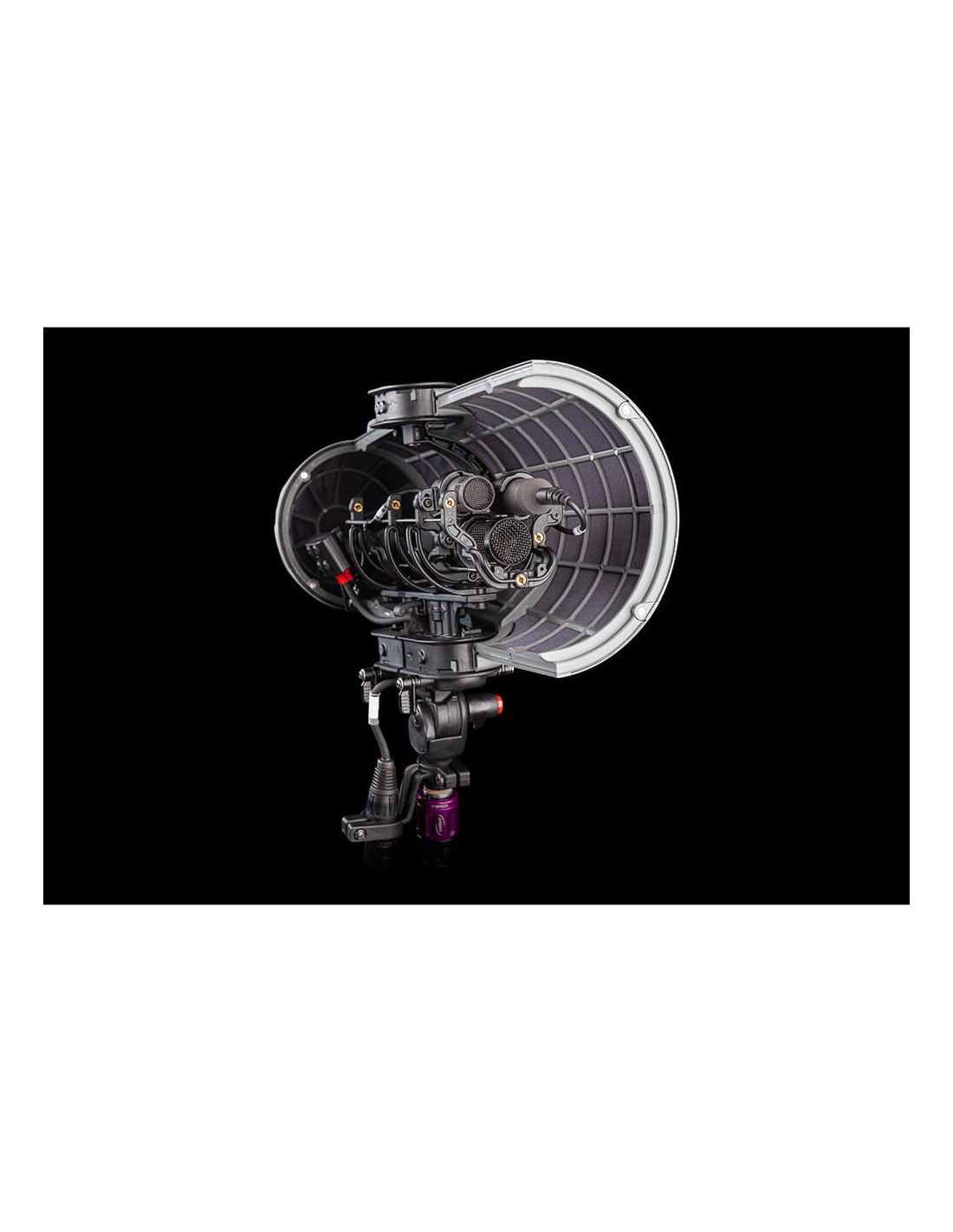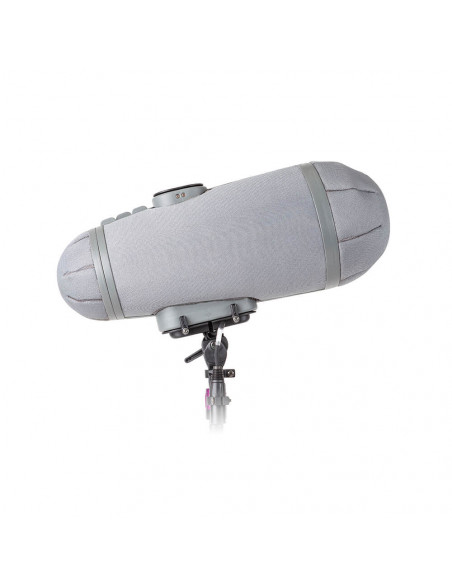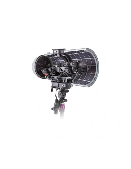 The Rycote Stereo Cyclone DMS Kit 3 for Sennheiser MKH 8040 Pair & MKH 30 is a windshield system offering acoustically transparent protection for location sound mixers and recordists using a pair of Sennheiser MKH 8040 microphones and a single MKH 30 in a double mid-side array in broadcast TV, film, video, and game audio production. It features an enhanced Connbox design with no straight or parallel surfaces to reduce room tone and resonance. Its Lyre mic suspension and Floating Basket Suspension improve vibration isolation and minimize handling noise.