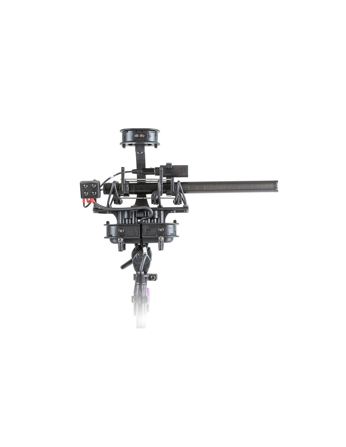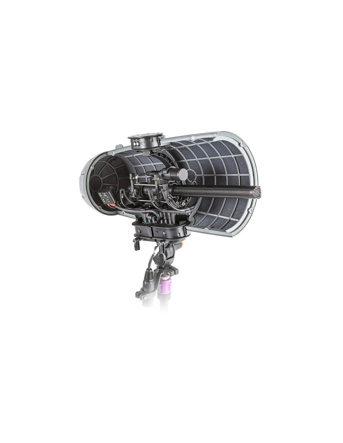 The Rycote Stereo Cyclone MS Kit 10 is a windshield system offering acoustically transparent protection for location sound mixers and recordists using a mid-side array of Sennheiser MKH 416 and Ambient Emesser microphones in broadcast TV, film, video, and game audio production. It features an enhanced Connbox design with no straight or parallel surfaces to reduce room tone and resonance. Its Lyre mic suspension and Floating Basket Suspension improve vibration isolation and minimize handling noise.