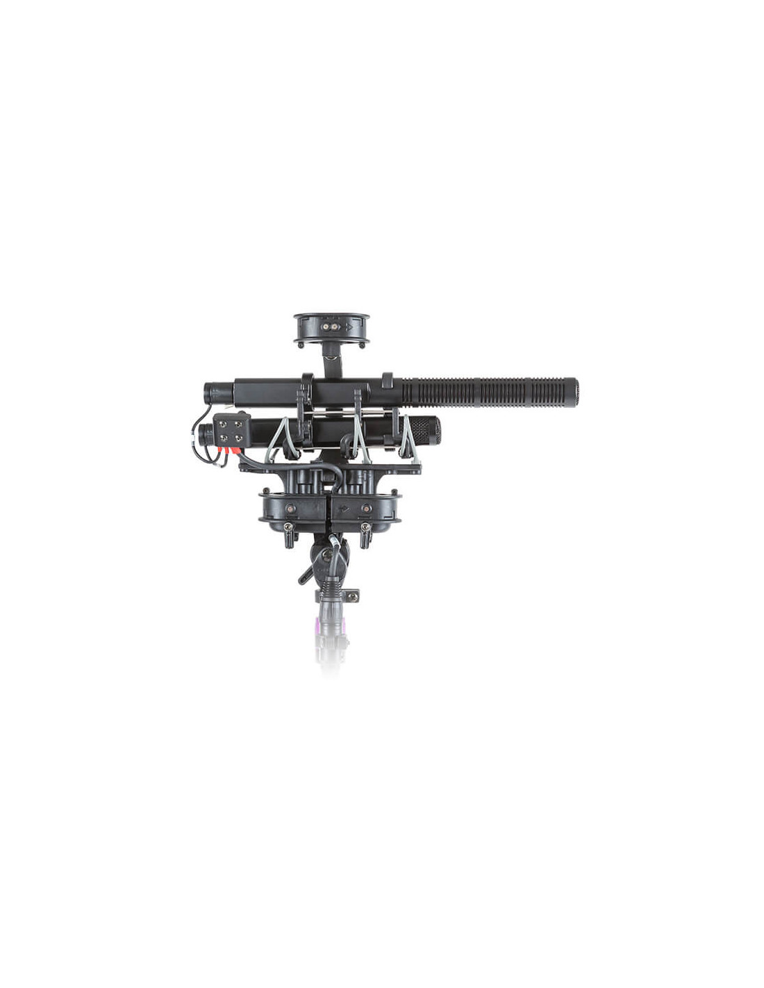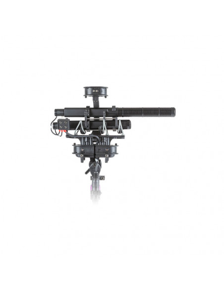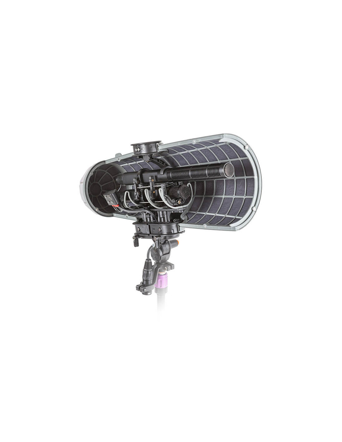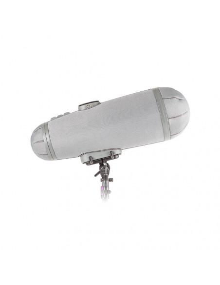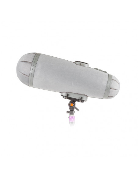 The Rycote Stereo Cyclone MS Kit 12 is a windshield system offering acoustically transparent protection for location sound mixers and recordists using a mid-side array of Sennheiser MKH 30 and MKH 60 microphones in broadcast TV, film, video, and game audio production. It features an enhanced Connbox design with no straight or parallel surfaces to reduce room tone and resonance. Its Lyre mic suspension and Floating Basket Suspension improve vibration isolation and minimize handling noise.