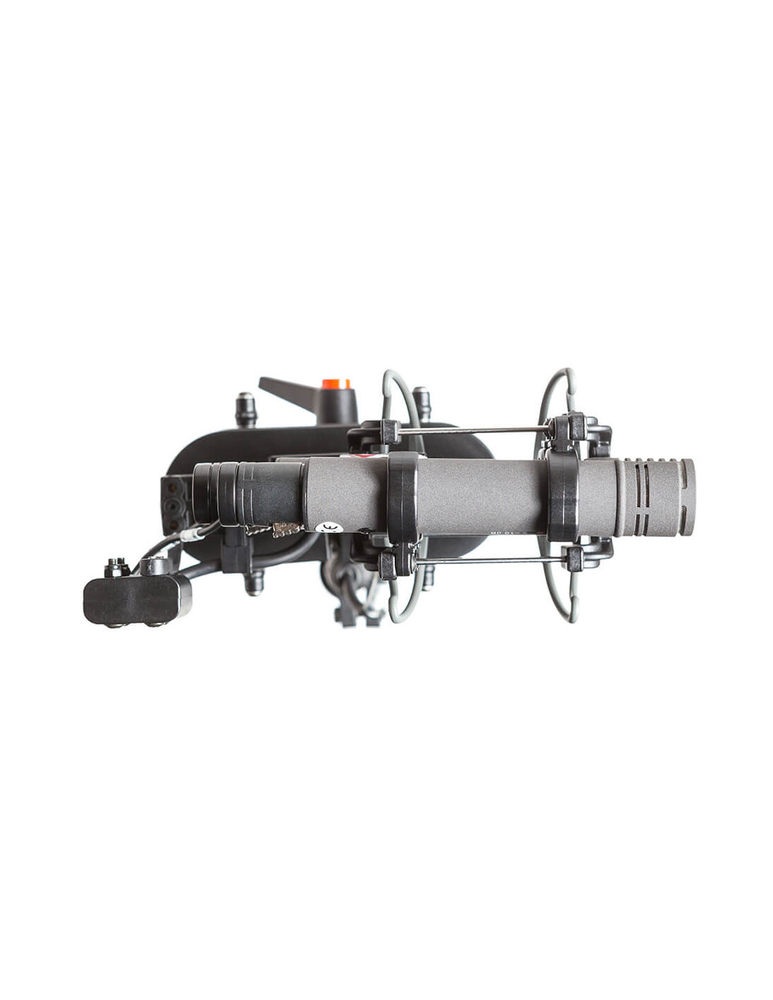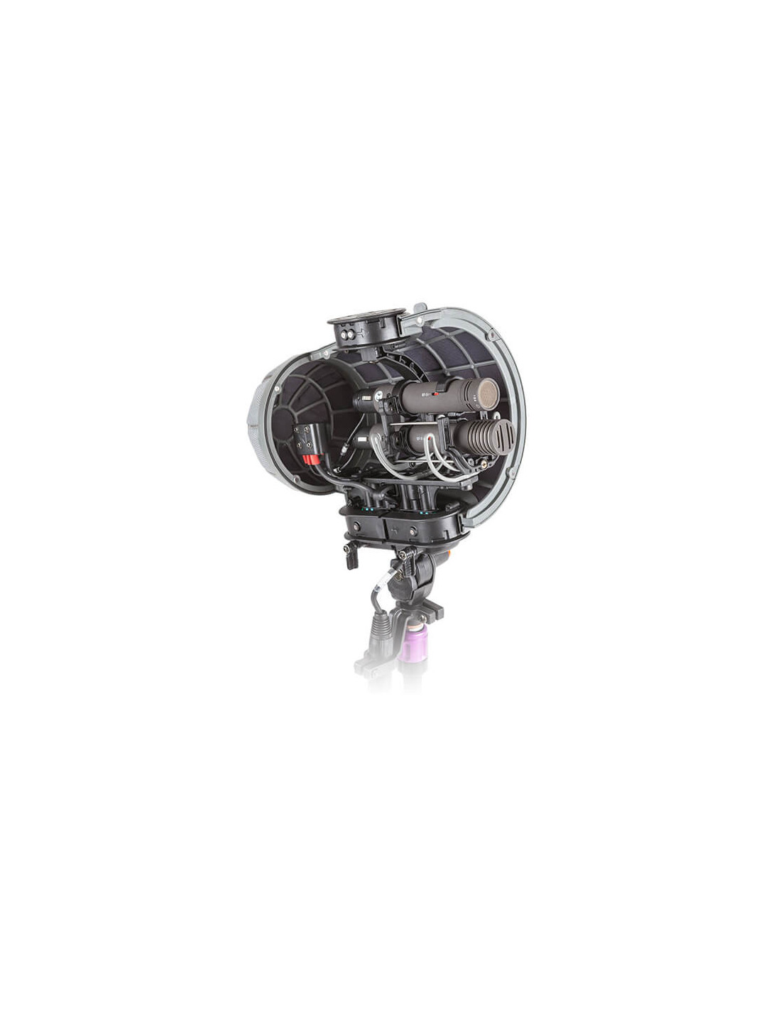 The Rycote Stereo Cyclone MS Kit 6 is a windshield system offering acoustically transparent protection for location sound mixers and recordists using a mid-side array of Neumann KM 120 and KM 140 microphones in broadcast TV, film, video, and game audio production. It features an enhanced Connbox design with no straight or parallel surfaces to reduce room tone and resonance. Its Lyre mic suspension and Floating Basket Suspension improve vibration isolation and minimize handling noise.