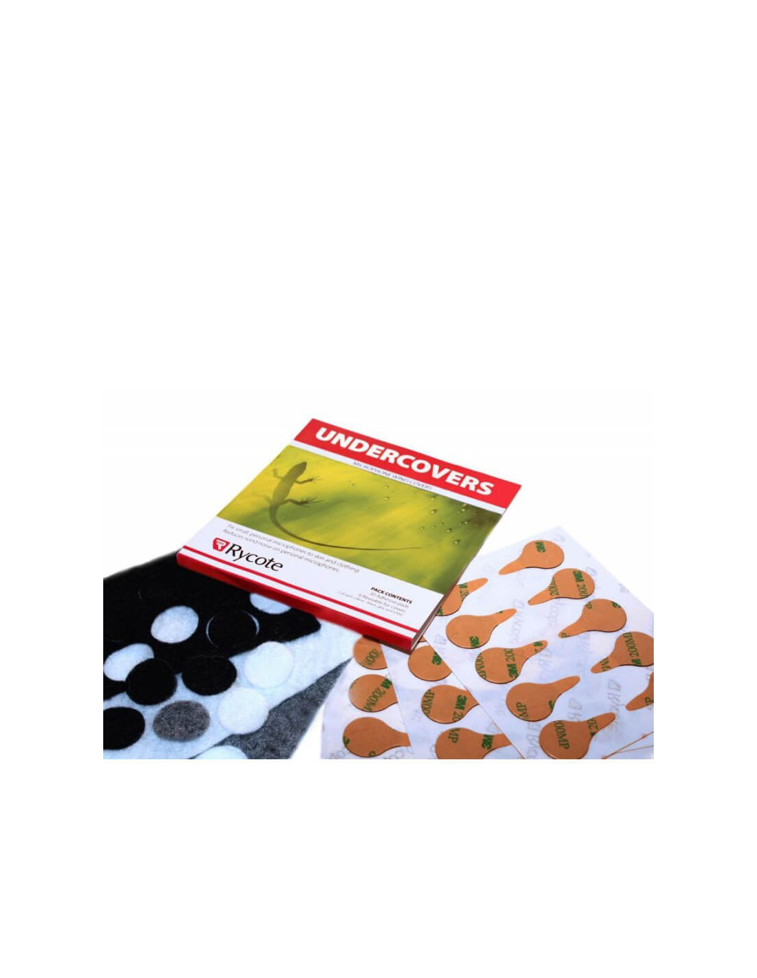 Undercovers Undercovers have been specifically designed for use with Lavalier mics under clothing. Using Stickies to affix the microphone, a soft fabric disc is then added on top to minimise the sounds of clothing rustle and low wind noise. Undercover Packs contain Stickies and fabric discs Specifications: Dimensions Width: 20 mm Length: 25 mm Suitable for Microphone Diameters: 4.5 mm Microphone Length (up to): 15 mm Maximum Wind-noise Attenuation: 10 dB Dimensions Width: 20 mm Length: 25 mm Suitable for Microphone Diameters: 4.5 mm Microphone Length (up to): 15 mm Maximum Wind-noise Attenuation: 10 dB