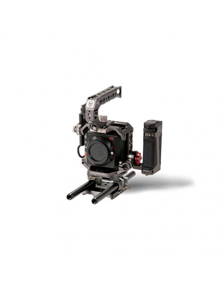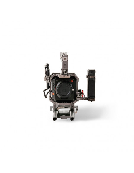 TILTA Full Camera Cage f Z Cam Professional Module This camera cage provides complete protective armor for the Z CAM E2, E2C, E2G, E2-S6, E2-F6, E2-F8 camera bodies. It provides several 1/4"-20 and 3/8"-16 mounting points as well as two Arri rosette mounting points and one cold shoe mounting point. The base of the cage also provides several mounting holes when attaching your camera to gimbals to more easily fine tune the balance of your setup. A variety of different baseplates can be attached to the bottom of the cage, allowing for various rod mounting and optional power supply configurations. The quick release top handle and various optional side handles can be attached to the cage to provide for different ways to comfortably operate your camera setup. This kit of the Z CAM cage includes: the base Z CAM cage, quick release top handle, Samsung T5 SSD drive holder, 90 degree USB-C cable for Z CAM, Arca quick release baseplate, Manfrotto quick release baseplate, 12V Micro DC male to Z CAM power cable, and the Tiltaing Side Power Handle Type II (F570 Battery). Technical Data: Color: Tilta Gray Materials: Aluminum Alloy, Stainless Steel