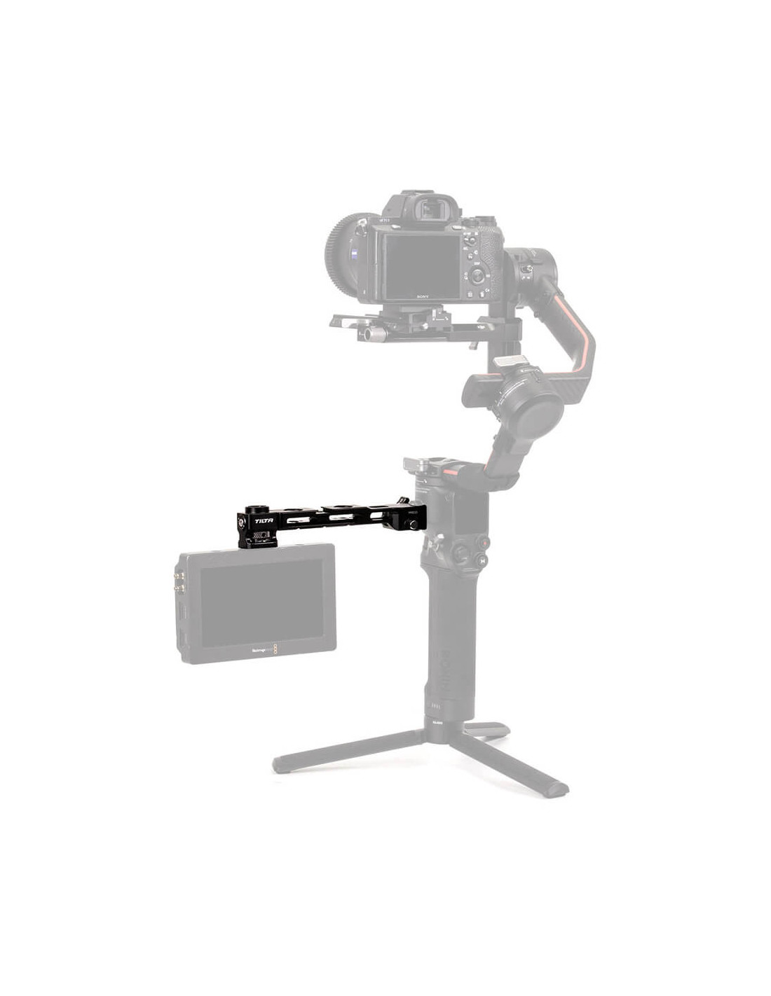 This bracket attaches to the side of the gimbal via a NATO rail connection and extends horizontally to the side to allow you to attach a small monitor to your setup via a finger-tightening 1/4″-20 screw.