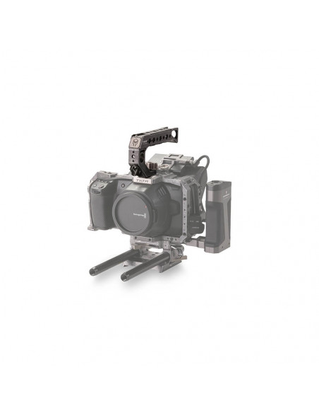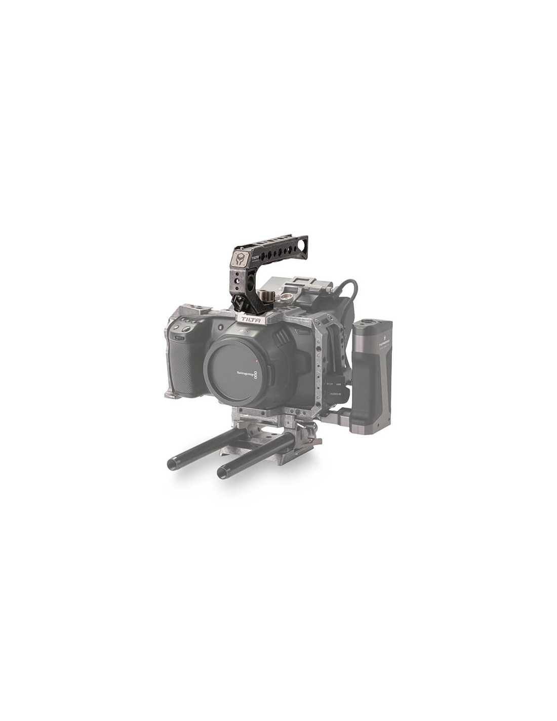 Quick Release Top Handle This quick release top handle easily and securely attaches to the top of the half and full Tiltaing camera cages. It provides several 1/4”-20 and 3/8”-16 mounting points as well as one cold shoe mounting point on the front and one on the back of the handle. Weight: 0.381 lbs Color: Tactical Gray Material: Aluminum-alloy, stainless steel Packing list: (1) Quick Release Top Handle (1) Cage Locking Screw with Spring (1) Rod Locking Screw